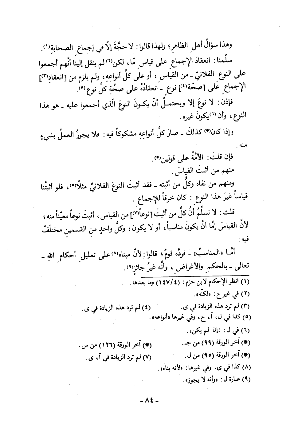 سلمنا انعقاد الإجماع على قياس ما لكن لم ينقل إلينا أنهم أجمعوا على النوع الفلانى من القياس أو على كل أنواعه ولم يلزم من انعقاد الإجماع على صحة نوع انعقاده على صحة كل نوع فإذن لا نوع إلا ويحتمل أن يكون النوع الذي أجمعوا عليه هو هذا النوع وأن يكون غيره وإذا كان كذلك صار كل أنواعه مشكوكا فيه فلا يجوز العمل بشئ منه فإن قلت الأمة على قولين منهم من أثبت القياس ومنهم من نفاه وكل من أثبته فقد أثبت النوع الفلانى مثلا فلو أثبتنا قياسا غير هذا النوع كان خرقا للإجماع قلت لا نسلم أن كل من أثبت نوعا من القياس أثبت نوعا معينا منه لأن القياس إما أن يكون مناسبا أو لا يكون وكل واحد من القسمين مختلف فيه أما المناسب فرده قوم قالوا لأن مبناه على تعليل أحكام الله تعالى بالحكم والأغراض وأنه غير جائز