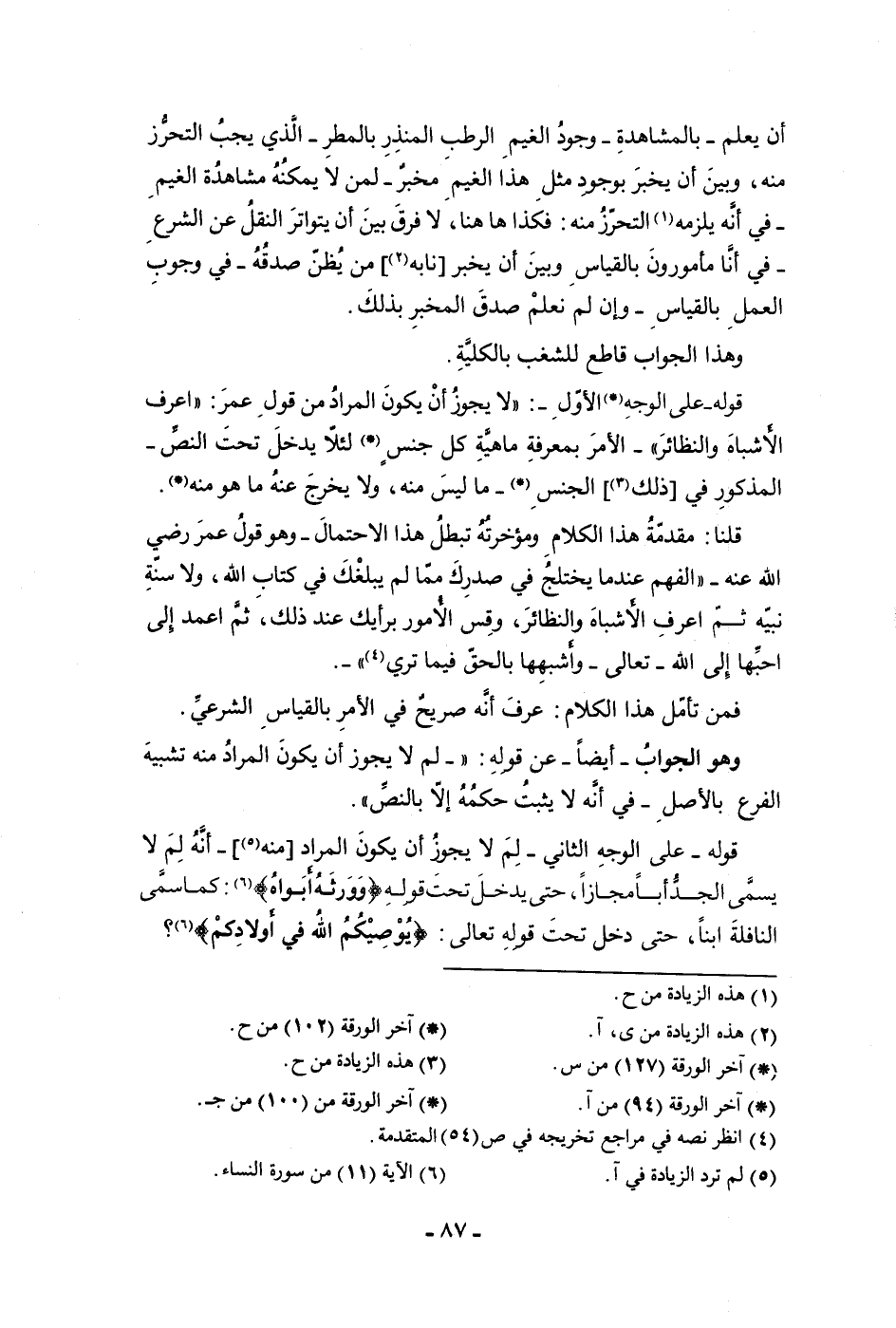 أن يعلم بالمشاهدة وجود الغيم الرطب المنذر بالمطر الذي يجب التحرز منه وبين أن يخبر بوجود مثل هذا الخيم مخبر لمن لا يمكنه مشاهدة الغيم في أنه يلزمه التحرز منه فكذا هاهنا لا فرق بين أن يتواتر النقل عن الشرع في أنا مأمورون بالقياس وبين أن يخبر نا به من يظن صدقه في وجوب العمل بالقياس وإن لم نعلم صدق المخبر بذلك وهذا الجواب قاطع للشغب بالكلية قوله على الوجه الأول لا يجوز أن يكون المراد من قول عمر اعرف الأشباه والنظائر الأمر بمعرفة ماهية كل جنس لئلا يدخل تحت النص المذكور في ذلك الجنس ما ليس منه ولا يخرج عنه ما هو منه قلنا مقدمة هذا الكلام ومؤخرته تبطل هذا الاحتمال وهو قول عمر رضي الله عنه الفهم عندما يختلج في صدرك مما لم يبلغك في كتاب الله ولا سنة نبيه ثم اعرف الأشباه والنظائر وقس الأمور برأيك عند ذلك ثم اعمد إلى أحبها إلى الله تعالى وأشبهها بالحق فيما ترى فمن تأمل هذا الكلام عرف أنه صريح في الأمر بالقياس الشرعي وهو الجواب أيضا عن قوله لم لا يجوز أن يكون المراد منه تشبيه