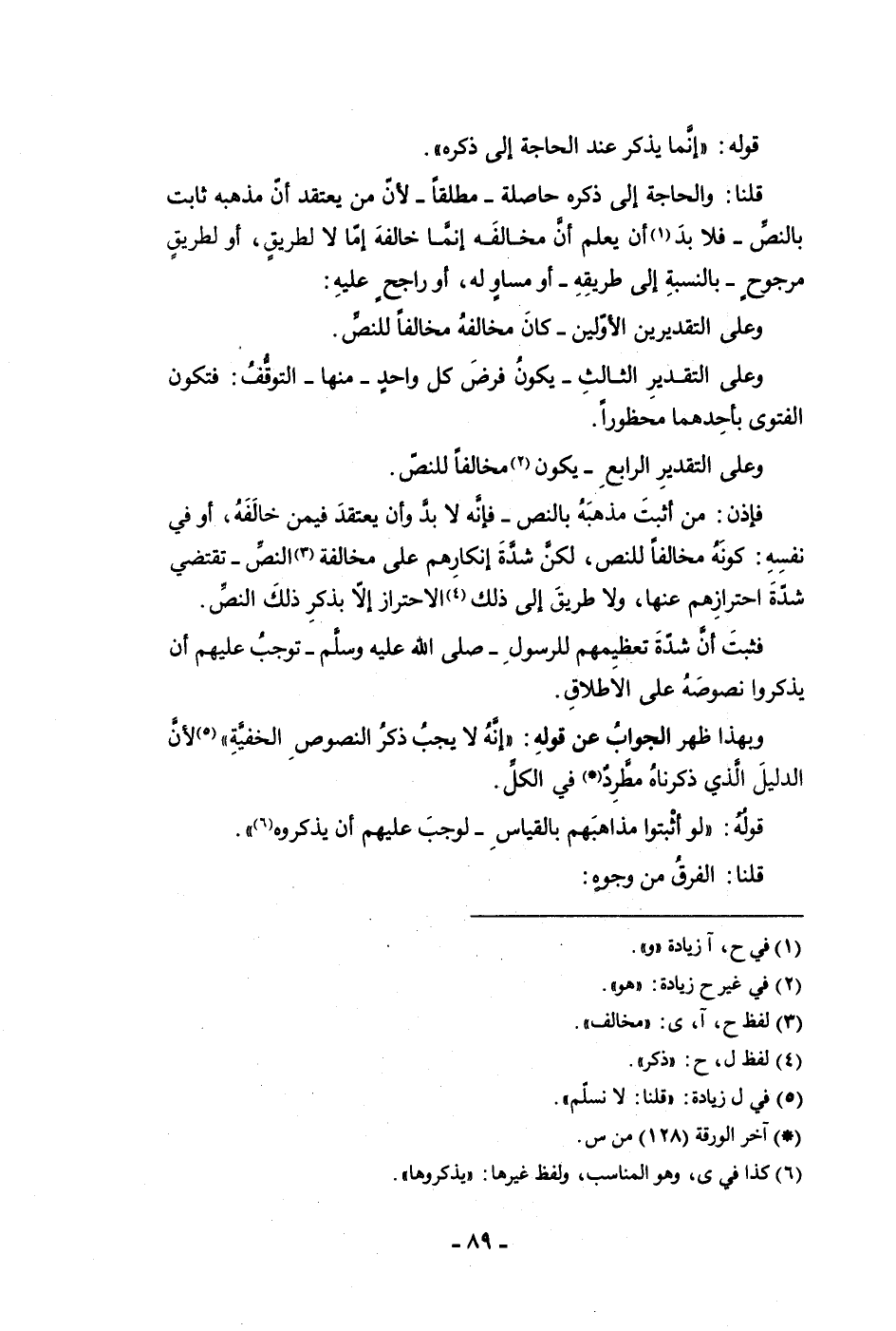 قوله إنما يذكر عند الحاجة إلى ذكره قلنا والحاجة إلى ذكره حاصلة مطلقا لأن من يعتقد أن مذهبه ثابت بالنص فلا بد أن يعلم أن مخالفه إنما خالفه إما لا لطريق أو لطريق مرجوح بالنسبة إلى طريقه أو مساوله أو راجح عليه وعلى التقديرين الأولين كان مخالفه مخالفا للنص وعلى التقدير الثالث يكون فرض كل واحد منها التوقف فتكون الفتوى بأحدهما محظورا وعلى التقدير الرابع يكون مخالفا للنص فإذن من أثبت مذهبه بالنص فإنه لا بد وأن يعتقد فيمن خالفه أو في نفسه كونه مخالفا للنص لكن شدة إنكارهم على مخالفة النص تقتضي شدة احترازهم عنها ولا طريق إلى ذلك الاحتراز إلا بذكر ذلك النص فثبت أن شدة تعظيمهم للرسول ص توجب عليهم أن يذكروا نصوصه على الإطلاق وبهذا ظهر الجواب عن قوله أنه لا يجب ذكر النصوص الخفية لأن الدليل الذي ذكرناه مطرد في الكل قوله لو أثبتوا مذاهبهم بالقياس لوجب عليهم أن يذكروه قلنا الفرق من وجوه
