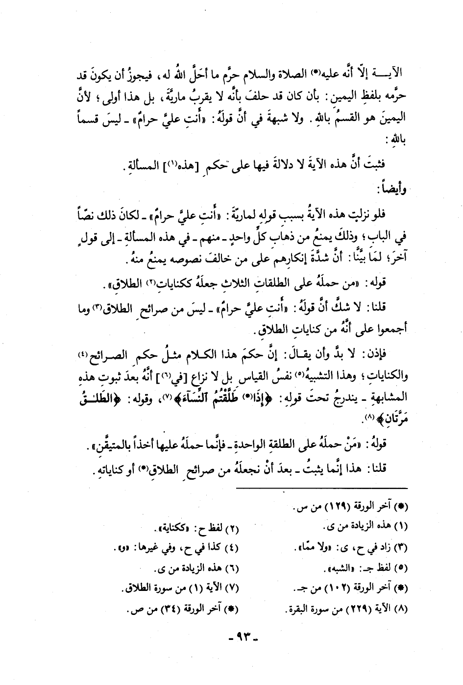 الآية إلا أنه عليه الصلاة والسلام حرم ما أحل الله له فيجوز أن يكون قد حرمه بلفظ اليمين بأن كان قد حلف بأنه لا يقرب مارية بل هذا أولى لأن اليمين القسم بالله ولا شبهة في أن قوله أنت على حرام ليس قسما بالله فثبت أن هذه الآية لا دلالة فيها على حكم هذه المسألة وأيضا فلو نزلت هذه الآية بسبب قوله لماريه يا أنت على حرام لكان ذلك نصا في الباب وذلك يمنع من ذهاب كل واحد منهم في هذه المسألة إلى قول آخر لما بينا أن شدة إنكارهم على من خالف نصوصه يمنع منه قوله من حمله على الطلقات الثلاث جعله ككنايات الطلاق قلنا لاشك أن قوله أنت على حرام ليس من صرائح الطلاق وما أجمعوا على أنه من كنايات الطلاق فإذن لابد وأن يقال إن حكم هذا الكلام مثل حكم الصرائح والكنايات وهذا التشبيه نفس القياس بل لا نزاع في أنه بعد ثبوت هذه المشابهة يندرج تحت قوله إذا طلقتم النساء وقوله الطلاق