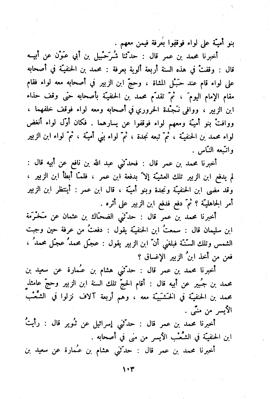 أَخْبَرَنَا مُحَمَّدُ بْنُ عُمَرَ قَالَ: حَدَّثَنَا شُرَحْبِيلُ بْنُ أَبِي عَوْنٍ , عَنْ أَبِيهِ قَالَ: وَقَفَتْ فِي هَذِهِ السَّنَةِ أَرْبَعَةُ أَلْوِيَةٍ بِعَرَفَةَ: مُحَمَّدُ ابْنُ الْحَنَفِيَّةِ فِي أَصْحَابِهِ عَلَى لِوَاءٍ. قَامَ عِنْدَ حَبْلِ الْمُشَاةِ , وَحَجَّ ابْنُ الزُّبَيْرِ فِي أَصْحَابِهِ مَعَهُ لِوَاءٌ , §فَقَامَ مَقَامَ الْإِمَامِ الْيَوْمَ , ثُمَّ تَقَدَّمَ مُحَمَّدُ ابْنُ الْحَنَفِيَّةِ بِأَصْحَابِهِ حَتَّى وَقَفَ حِذَاءَ ابْنِ الزُّبَيْرِ , وَوَافَى نَجْدَةَ الْحَرُورِيَّ فِي أَصْحَابِهِ وَمَعَهُ لِوَاءٌ , فَوَقَفَ خَلْفَهُمَا , وَوَافَتْ بَنُو أُمَيَّةَ وَمَعَهُمْ لِوَاءٌ , فَوَقَفُوا عَنْ يَسَارِهِمَا , فَكَانَ أَوَّلُ لِوَاءٍ أَنْغَضَ لِوَاءُ مُحَمَّدِ ابْنِ الْحَنَفِيَّةِ ثُمَّ تَبِعَهُ نَجْدَةُ , ثُمَّ لِوَاءُ بَنِي أُمَيَّةَ , ثُمَّ لِوَاءُ ابْنِ الزُّبَيْرِ , وَاتَّبَعَهُ النَّاسُ "