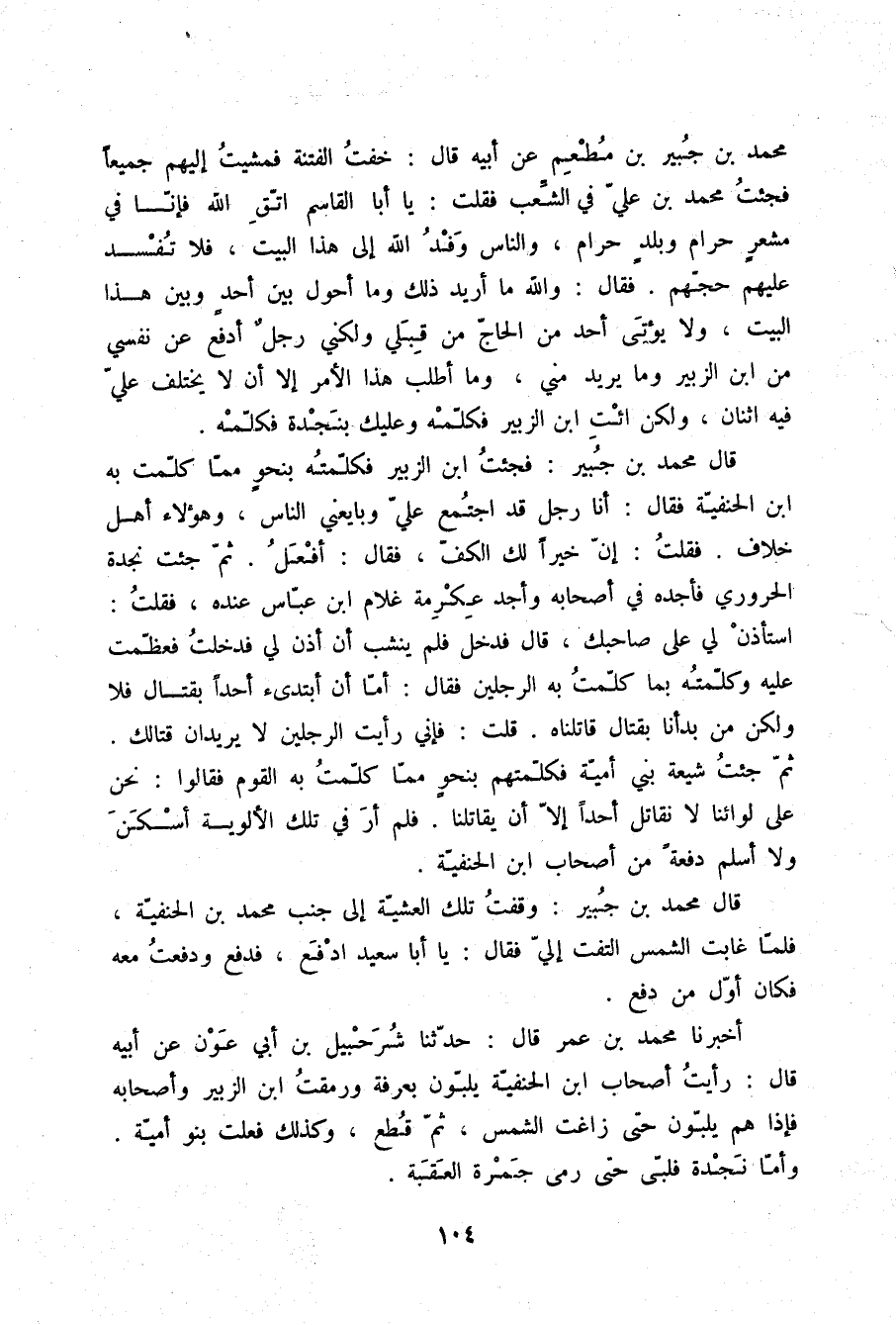 مُحَمَّدِ بْنِ جُبَيْرِ بْنِ مُطْعِمٍ , عَنْ أَبِيهِ قَالَ: " §خِفْتُ الْفِتْنَةَ , فَمَشَيْتُ إِلَيْهِمْ جَمِيعًا , فَجِئْتُ مُحَمَّدَ بْنَ عَلِيٍّ فِي الشِّعْبِ , فَقُلْتُ: يَا أَبَا الْقَاسِمِ , اتَّقِ اللَّهَ؛ فَإِنَّا فِي مِشْعَرٍ حَرَامٍ وَبَلَدٍ حَرَامٍ , وَالنَّاسُ وَفْدُ اللَّهِ إِلَى هَذَا الْبَيْتِ , فَلَا تُفْسِدْ عَلَيْهِمْ حَجَّهُمْ , فَقَالَ: وَاللَّهِ , مَا أُرِيدُ ذَلِكَ , وَمَا أَحُولُ بَيْنَ أَحَدٍ وَبَيْنَ هَذَا الْبَيْتِ , وَلَا يُؤْتَى أَحَدٌ مِنَ الْحَاجِّ مِنْ قِبَلِي , وَلَكِنِّي رَجُلٌ أَدْفَعُ عَنْ نَفْسِي مِنِ ابْنِ الزُّبَيْرِ وَمَا يُرِيدُ مِنِّي , وَمَا أَطْلُبُ هَذَا الْأَمْرَ إِلَّا أَنْ لَا يَخْتَلِفَ عَلَيَّ فِيهِ اثْنَانِ , وَلَكِنِ ائْتِ ابْنَ الزُّبَيْرِ فَكَلِّمْهُ , وَعَلَيْكَ بِنَجْدَةَ فَكَلِّمْهُ " قَالَ مُحَمَّدُ بْنُ جُبَيْرٍ , فَجِئْتُ ابْنَ الزُّبَيْرِ فَكَلَّمْتُهُ بِنَحْوٍ مِمَّا كَلَّمْتُ بِهِ ابْنَ الْحَنَفِيَّةِ , فَقَالَ: أَنَا رَجُلٌ قَدِ اجْتَمَعَ عَلَيَّ وَبَايَعَنِي النَّاسُ , وَهَؤُلَاءِ أَهْلُ خِلَافٍ , فَقُلْتُ: إِنَّ خَيْرًا لَكَ الْكَفٌّ , فَقَالَ: أَفْعَلُ , ثُمَّ جِئْتُ نَجْدَةَ الْحَرُورِيَّ , فَأَجِدُهُ فِي أَصْحَابِهِ وَأَجِدُ عِكْرِمَةَ غُلَامَ ابْنِ عَبَّاسٍ عِنْدَهُ , فَقُلْتُ: اسْتَأْذِنْ لِي عَلَى صَاحِبِكَ. قَالَ: فَدَخَلَ , فَلَمْ يَنْشَبْ أَنْ أَذِنَ لِي , فَدَخَلْتُ , فَعَظَّمْتُ عَلَيْهِ , وَكَلَّمْتُهُ بِمَا كَلَّمْتُ بِهِ الرَّجُلَيْنِ , فَقَالَ: أَمَّا أَنْ أَبْتَدِئَ أَحَدًا بِقِتَالٍ فَلَا , وَلَكِنْ مَنْ بَدَأْنَا بِقِتَالٍ قَاتَلْنَاهُ. قُلْتُ: فَإِنِّي رَأَيْتُ الرَّجُلَيْنِ لَا يُرِيدَانِ قِتَالَكَ , ثُمَّ جِئْتُ شِيعَةَ بَنِي أُمَيَّةَ , فَكَلَّمْتُهُمْ بِنَحْوٍ مِمَّا كَلَّمْتُ بِهِ الْقَوْمَ , فَقَالُوا: نَحْنُ عَلَى لِوَائِنَا لَا نُقَاتِلُ أَحَدًا إِلَّا أَنْ يُقَاتِلَنَا , فَلَمْ أَرَ فِي تِلْكَ الْأَلْوِيَةِ أَسْكَنَ وَلَا أَسْلَمَ دَفْعَةً مِنْ أَصْحَابِ ابْنِ الْحَنَفِيَّةِ قَالَ مُحَمَّدُ بْنُ جُبَيْرٍ: وَقَفْتُ تِلْكَ الْعَشِيَّةَ إِلَى جَنْبِ مُحَمَّدِ ابْنِ الْحَنَفِيَّةِ , فَلَمَّا غَابَتِ الشَّمْسُ الْتَفَتَ إِلَيَّ , فَقَالَ: يَا أَبَا سَعِيدٍ , ادْفَعْ فَدَفَعَ , وَدَفَعْتُ مَعَهُ , فَكَانَ أَوَّلَ مَنْ دَفَعَ