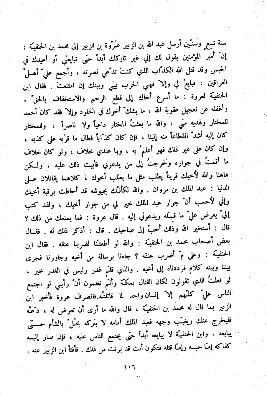 سَنَةَ تِسْعٍ وَسِتِّينَ أَرْسَلَ عَبْدُ اللَّهِ بْنُ الزُّبَيْرِ عُرْوَةَ بْنَ الزُّبَيْرِ إِلَى مُحَمَّدِ ابْنِ الْحَنَفِيَّةِ: إِنَّ أَمِيرَ الْمُؤْمِنِينَ يَقُولُ لَكَ: إِنِّي غَيْرُ تَارِكُكَ أَبَدًا حَتَّى تُبَايِعَنِي أَوْ أُعِيدَكَ فِي الْحَبْسِ , وَقَدْ قَتَلَ اللَّهُ الْكَذَّابَ الَّذِي كُنْتَ تَدَّعِي نُصْرَتَهُ , وَأَجْمَعَ عَلَيَّ أَهْلُ الْعِرَاقَيْنِ , فَبَايِعْ لِي , وَإِلَّا فَهِيَ الْحَرْبُ بَيْنِي وَبَيْنَكَ إِنِ امْتَنَعْتَ , فَقَالَ ابْنُ الْحَنَفِيَّةِ لِعُرْوَةَ: مَا أَسْرَعَ أَخَاكَ إِلَى قَطْعِ الرَّحِمِ وَالْإِسْتِخْفَافِ بِالْحَقِّ , وَأَغْفَلَهُ عَنْ تَعْجِيلِ عُقُوبَةِ اللَّهِ مَا يَشُكُّ أَخُوكَ فِي الْخُلُودِ وَإِلَّا فَقَدْ كَانَ أَحْمَدَ لِلْمُخْتَارِ وَلِهَدْيِهِ مِنِّي , وَاللَّهِ مَا بَعَثْتُ الْمُخْتَارَ دَاعِيًا وَلَا نَاصِرًا , وَلَلْمُخْتَارُ كَانَ إِلَيْهِ أَشَدَّ انْقِطَاعًا مِنْهُ إِلَيْنَا , فَإِنْ كَانَ كَذَّابًا فَطَالَ مَا قَرَّبَهُ عَلَى كَذِبِهِ , وَإِنْ كَانَ عَلَى غَيْرِ ذَلِكَ فَهُوَ أَعْلَمُ بِهِ , وَمَا عِنْدِي خِلَافٌ , وَلَوْ كَانَ خِلَافَ مَا أَقَمْتُ فِي جِوَارِهِ , وَلَخَرَجْتُ إِلَى مَنْ يَدْعُونِي , فَأَبَيْتُ ذَلِكَ عَلَيْهِ , وَلَكِنْ هَاهُنَا وَاللَّهِ لِأَخِيكَ قَرِينًا يَطْلُبُ مِثْلَ مَا يَطْلُبُ أَخُوكَ كِلَاهُمَا يُقَاتِلَانِ عَلَى الدُّنْيَا: عَبْدُ الْمَلِكِ بْنُ مَرْوَانَ , وَاللَّهِ لَكَأَنَّكَ بِجُيُوشِهِ قَدْ أَحَاطَتْ بِرَقَبَةِ أَخِيكَ , وَإِنِّي لَأَحْسَبُ أَنَّ جِوَارَ عَبْدِ الْمَلِكِ خَيْرٌ لِي مِنْ جِوَارِ أَخِيكَ , وَلَقَدْ كَتَبَ إِلَيَّ يَعْرِضُ عَلَيَّ مَا قَبِلَهُ , وَيَدْعُونِي إِلَيْهِ. قَالَ عُرْوَةُ: فَمَا يَمْنَعُكَ مِنْ ذَلِكَ؟ قَالَ: أَسْتَخِيرُ اللَّهَ وَذَلِكَ أَحَبُّ إِلَى صَاحِبِكَ. قَالَ: أَذْكُرُ ذَلِكَ لَهُ. فَقَالَ بَعْضُ أَصْحَابِ مُحَمَّدِ ابْنِ الْحَنَفِيَّةِ: وَاللَّهِ , لَوْ أَطَعْتَنَا لَضَرَبْنَا عُنُقَهُ , فَقَالَ ابْنُ الْحَنَفِيَّةِ: وَعَلَامَ أَضْرِبُ عُنُقَهُ جَاءَنَا بِرِسَالَةٍ مِنْ أَخِيهِ , وَجَاوَرَنَا فَجَرَى بَيْنَنَا وَبَيْنَهُ كَلَامٌ , فَرَدَدْنَاهُ إِلَى أَخِيهِ , وَالَّذِي قُلْتُمْ غَدْرٌ وَلَيْسَ فِي الْغَدْرِ خَيْرٌ , لَوْ فَعَلْتُ الَّذِي تَقُولُونَ لَكَانَ الْقِتَالُ بِمَكَّةَ وَأَنْتُمْ تَعْلَمُونَ أَنَّ رَأْيِي لَوِ اجْتَمَعَ النَّاسُ عَلَيَّ كُلُّهُمْ إِلَّا إِنْسَانٌ وَاحِدٌ لَمَا قَاتَلْتُهُ , فَانْصَرَفَ عُرْوَةُ فَأَخْبَرَ ابْنَ الزُّبَيْرِ بِمَا قَالَ لَهُ مُحَمَّدُ ابْنُ الْحَنَفِيَّةِ. قَالَ: وَاللَّهِ , مَا أَرَى أَنْ تُعْرِضَ لَهُ. دَعْهُ , فَلْيَخْرُجْ عَنْكَ وَيُغَيِّبُ وَجْهَهُ , فَعَبْدُ الْمَلِكِ أَمَامَهُ لَا يَتْرُكُهُ يَحِلُّ بِالشَّامِ حَتَّى يُبَايِعَهُ وَابْنُ الْحَنَفِيَّةِ لَا يُبَايِعُهُ أَبَدًا حَتَّى يَجْتَمِعَ النَّاسُ عَلَيْهِ , فَإِنْ صَارَ إِلَيْهِ كَفَاكَهُ إِمَّا حَبَسَهُ , وَإِمَّا قَتَلَهُ , فَتَكُونَ أَنْتَ قَدْ بَرِئَتْ مِنْ ذَلِكَ. فَأَفْثَأَ ابْنُ الزُّبَيْرِ عَنْهُ "