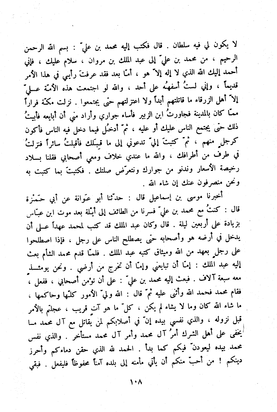 لَا يَكُونُ لِي فِيهِ سُلْطَانٌ. قَالَ: فَكَتَبَ إِلَيْهِ مُحَمَّدُ بْنُ عَلِيٍّ: بِسْمِ اللَّهِ الرَّحْمَنِ الرَّحِيمِ , مِنْ مُحَمَّدِ بْنِ عَلِيٍّ إِلَى عَبْدِ الْمَلِكِ بْنِ مَرْوَانَ. سَلَّامٌ عَلَيْكَ , فَإِنِّي أَحْمَدُ إِلَيْكَ اللَّهَ الَّذِي لَا إِلَهَ إِلَّا هُوَ , أَمَّا بَعْدُ , فَقَدْ عَرَفْتَ رَأْيِي فِي هَذَا الْأَمْرِ قَدِيمًا , وَإِنِّي لَسْتُ أُسَفِّهُهُ عَلَى أَحَدٍ , وَاللَّهِ لَوِ اجْتَمَعَتْ هَذِهِ الْأُمَّةُ عَلَيَّ إِلَّا أَهْلُ الزَّرْقَاءِ مَا قَاتَلْتُهُمْ أَبَدًا وَلَا اعْتَزَلْتُهُمْ حَتَّى يَجْتَمِعُوا نَزَلْتُ مَكَّةَ فِرَارًا مِمَّا كَانَ بِالْمَدِينَةِ , فَجَاوَرْتُ ابْنَ الزُّبَيْرِ , فَأَسَاءَ جِوَارِي , وَأَرَادَ مِنِّي أَنْ أُبَايِعَهُ فَأَبَيْتُ ذَلِكَ حَتَّى يَجْتَمِعَ النَّاسُ عَلَيْكَ أَوْ عَلَيْهِ , ثُمَّ أَدْخُلَ فِيمَا دَخَلَ فِيهِ النَّاسُ , فَأَكُونُ كَرَجُلٍ مِنْهُمْ , ثُمَّ كَتَبْتَ إِلَيَّ تَدْعُونِي إِلَى مَا قِبَلِكَ , فَأَقْبَلْتُ سَائِرًا , فَنَزَلْتُ فِي طَرَفٍ مِنْ أَطْرَافِكَ , وَاللَّهِ مَا عِنْدِي خِلَافٌ وَمَعِي أَصْحَابِي , فَقُلْنَا بِلَادٌ رَخِيصَةُ الْأَسْعَارِ وَنَدْنُو مِنْ جِوَارِكَ وَنَتَعَرَّضُ صِلَتَكَ , فَكَتَبْتَ بِمَا كَتَبْتَ بِهِ وَنَحْنُ مُنْصَرِفُونَ عَنْكَ إِنْ شَاءَ اللَّهُ