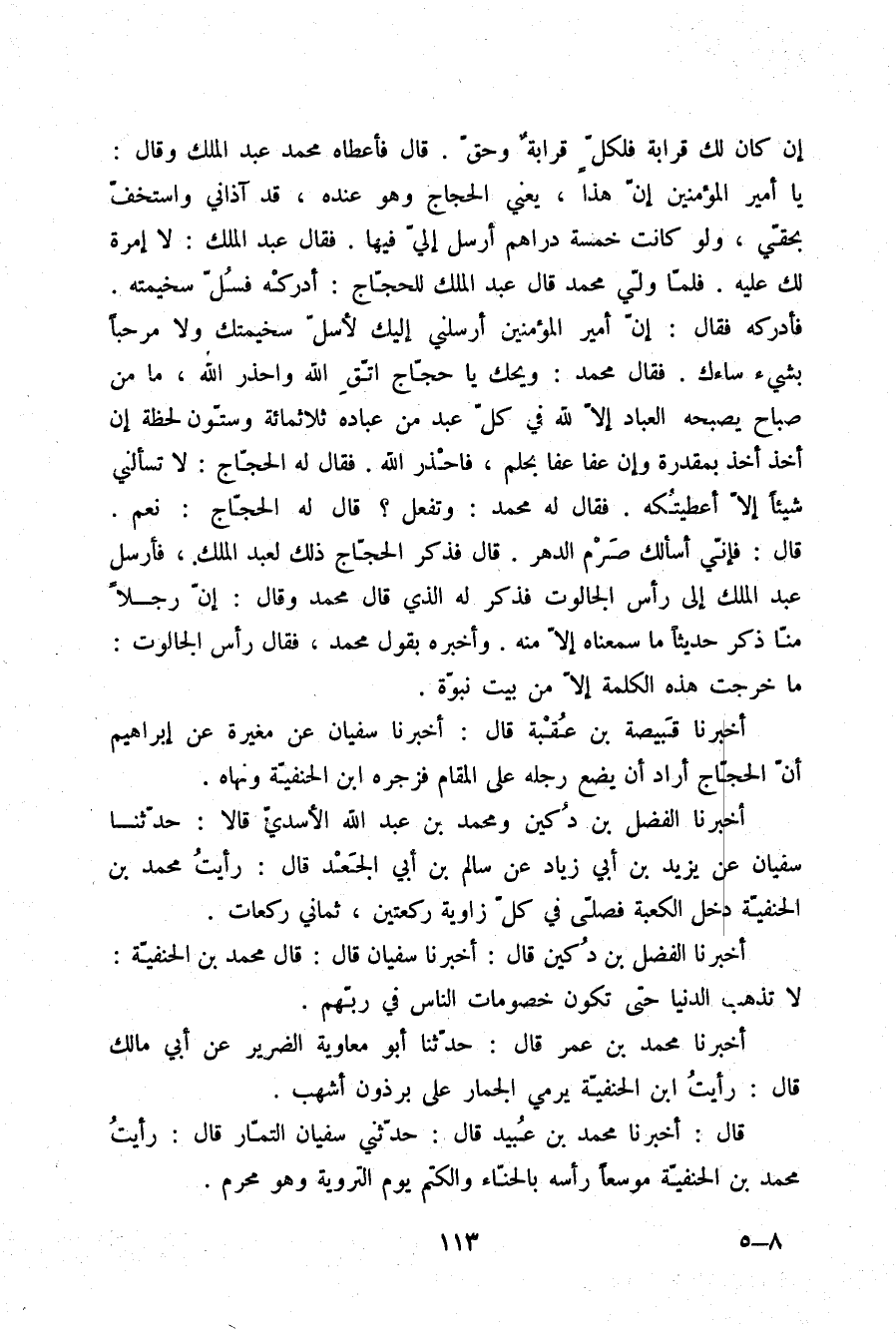 أَخْبَرَنَا قَبِيصَةُ بْنُ عُقْبَةَ قَالَ: أَخْبَرَنَا سُفْيَانُ , عَنْ مُغِيرَةَ , عَنْ إِبْرَاهِيمَ «أَنَّ الْحَجَّاجَ §أَرَادَ أَنْ يَضَعَ رِجْلَهُ عَلَى الْمَقَامِ , فَزَجَرَهُ ابْنُ الْحَنَفِيَّةِ , وَنَهَاهُ»