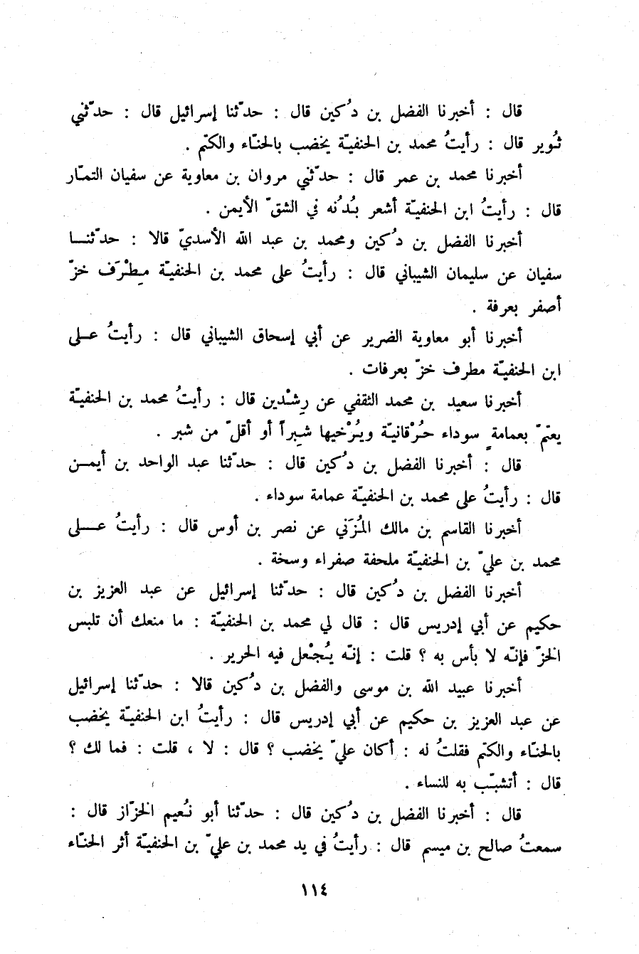قَالَ: أَخْبَرَنَا الْفَضْلُ بْنُ دُكَيْنٍ قَالَ: حَدَّثَنَا إِسْرَائِيلُ قَالَ: حَدَّثَنِي ثُوَيْرٌ قَالَ: «§رَأَيْتُ مُحَمَّدَ ابْنَ الْحَنَفِيَّةِ يُخَضِّبُ بِالْحِنَّاءِ وَالْكَتَمِ»