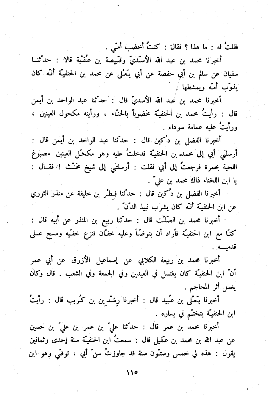 أَخْبَرَنَا مُحَمَّدُ بْنُ عَبْدِ اللَّهِ الْأَسَدِيُّ قَالَ: حَدَّثَنَا عَبْدُ الْوَاحِدِ بْنُ أَيْمَنَ قَالَ: «رَأَيْتُ مُحَمَّدَ ابْنَ الْحَنَفِيَّةِ مَخْضُوبًا بِالْحِنَّاءِ وَرَأَيْتُهُ مَكْحُولَ الْعَيْنَيْنِ , §وَرَأَيْتُ عَلَيْهِ عِمَامَةً سَوْدَاءَ»