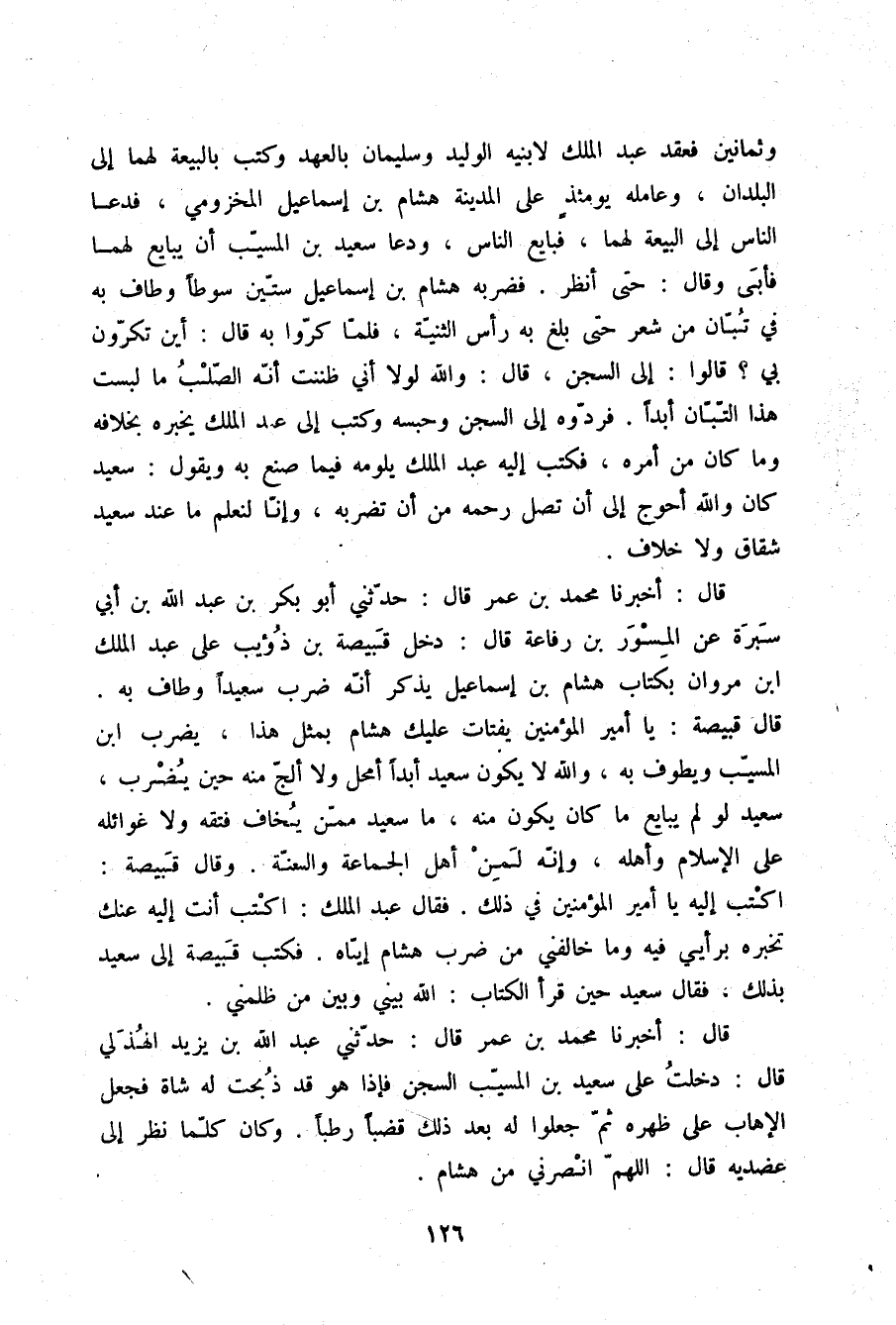 قَالَ: أَخْبَرَنَا مُحَمَّدُ بْنُ عُمَرَ قَالَ: حَدَّثَنِي أَبُو بَكْرِ بْنُ عَبْدِ اللَّهِ بْنِ أَبِي سَبْرَةَ , عَنِ الْمِسْوَرِ بْنِ رِفَاعَةَ قَالَ: دَخَلَ قَبِيصَةُ بْنُ ذُؤَيْبٍ عَلَى عَبْدِ الْمَلِكِ بْنِ مَرْوَانَ بِكِتَابِ هِشَامِ بْنِ عَبْدِ الْمَلِكِ يَذْكُرُ أَنَّهُ §ضَرَبَ سَعِيدًا , وَطَافَ بِهِ. قَالَ قَبِيصَةُ: يَا أَمِيرَ الْمُؤْمِنِينَ , يُفْتَاتُ عَلَيْكَ هِشَامٌ بِمِثْلِ هَذَا , يَضْرِبُ ابْنَ الْمُسَيِّبِ وَيَطُوفُ بِهِ , وَاللَّهِ لَا يَكُونُ سَعِيدٌ أَبَدًا أَمْحَلَ وَلَا أَلَجَّ مِنْهُ حِينَ يُضْرَبُ , سَعِيدٌ لَوْ لَمْ يُبَايِعْ مَا كَانَ يَكُونُ مِنْهُ , مَا سَعِيدٌ مِمَّنْ يُخَافُ فَتْقُهُ وَلَا غَوَائِلُهُ عَلَى الْإِسْلَامِ وَأَهْلِهِ , وَإِنَّهُ لَمِنْ أَهْلِ الْجَمَاعَةِ وَالسُّنَّةِ. وَقَالَ قَبِيصَةُ: اكْتُبْ إِلَيْهِ يَا أَمِيرَ الْمُؤْمِنِينَ فِي ذَلِكَ , فَقَالَ عَبْدُ الْمَلِكِ: اكْتُبْ أَنْتَ إِلَيْهِ عَنْكَ تُخْبِرْهُ بِرَأْيِي فِيهِ , وَمَا خَالَفَنِي مِنْ ضَرْبِ هِشَامٍ إِيَّاهُ , فَكَتَبَ قَبِيصَةُ إِلَى سَعِيدٍ بِذَلِكَ , فَقَالَ سَعِيدٌ حِينَ قَرَأَ الْكِتَابَ: اللَّهُ بَيْنِي وَبَيْنَ مَنْ ظَلَمَنِي "