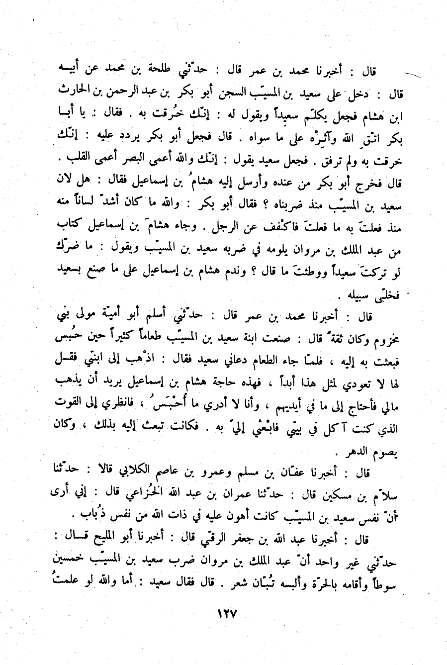 قَالَ: أَخْبَرَنَا عَبْدُ اللَّهِ بْنُ جَعْفَرٍ الرَّقِّيُّ قَالَ: أَخْبَرَنَا أَبُو الْمَلِيحِ قَالَ: حَدَّثَنِي غَيْرُ وَاحِدٍ " أَنَّ عَبْدَ الْمَلِكِ بْنَ مَرْوَانَ ضَرَبَ سَعِيدَ بْنَ الْمُسَيِّبِ خَمْسِينَ سَوْطًا , وَأَقَامَهُ بِالْحَرَّةِ , وَأَلْبَسَهُ تُبَّانَ شَعْرٍ. قَالَ: فَقَالَ سَعِيدٌ: §أَمَا وَاللَّهِ , لَوْ عَلِمْتُ -[128]- أَنَّهُمْ لَا يَزِيدُونَنِي عَلَى الضَّرْبِ مَا لَبِسْتُ لَهُمُ التُّبَّانَ؛ إِنَّمَا تَخَوَّفْتُ أَنْ يَقْتُلُونِي , فَقُلْتُ: تُبَّانٌ أَسْتَرُ مِنْ غَيْرِهِ. قَالَ مُحَمَّدُ بْنُ عُمَرَ مَعْنَى هَذَا الْحَدِيثِ أَنَّهُ ضَرَبَ فِي خِلَافَةِ عَبْدِ الْمَلِكِ بْنِ مَرْوَانَ "