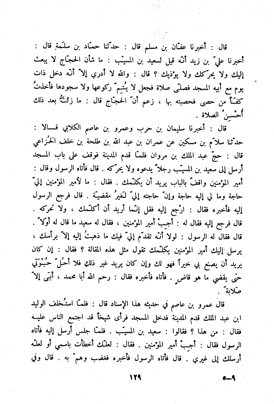 قَالَ: أَخْبَرَنَا عَفَّانُ بْنُ مُسْلِمٍ قَالَ: حَدَّثَنَا حَمَّادُ بْنُ سَلَمَةَ قَالَ: أَخْبَرَنَا عَلِيُّ بْنُ زَيْدٍ أَنَّهُ قِيلَ لِسَعِيدِ بْنِ الْمُسَيِّبِ: §مَا شَأْنُ الْحَجَّاجِ لَا يَبْعَثُ إِلَيْكَ وَلَا يُحَرِّكُكَ وَلَا يُؤْذِيكَ؟ قَالَ: وَاللَّهِ , لَا أَدْرِي إِلَّا أَنَّهُ دَخَلَ ذَاتَ يَوْمٍ مَعَ أَبِيهِ الْمَسْجِدَ فَصَلَّى صَلَاةً , فَجَعَلَ لَا يُتِمَّ رُكُوعَهَا وَلَا سُجُودَهَا , فَأَخَذْتُ كَفًّا مِنْ حَصَى فَحَصَبْتُهُ بِهَا , زَعَمَ أَنَّ الْحَجَّاجَ قَالَ: مَا زِلْتُ بَعْدَ ذَلِكَ أُحْسِنُ الصَّلَاةَ "
