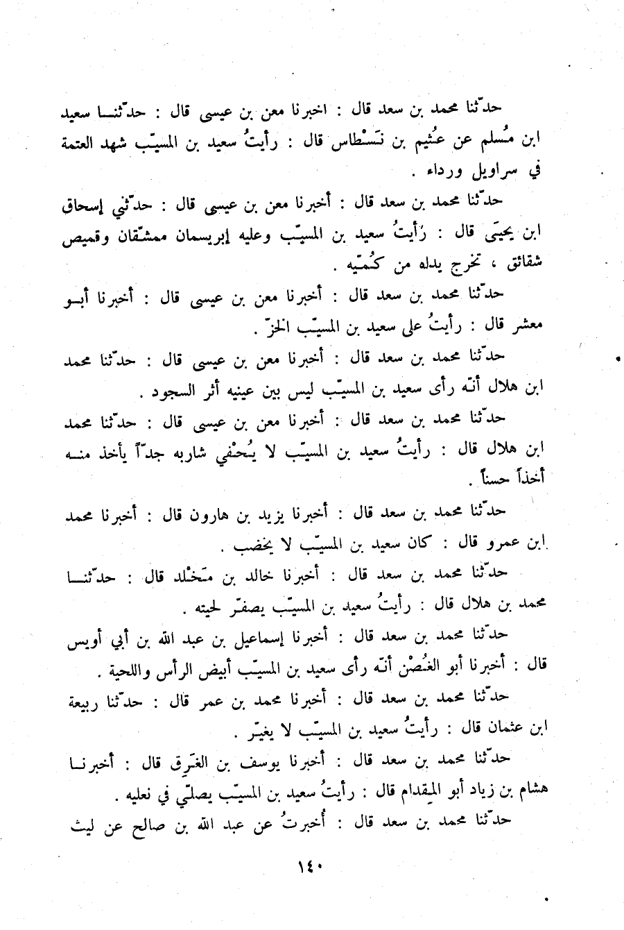 حَدَّثَنَا مُحَمَّدُ بْنُ سَعْدٍ قَالَ: أَخْبَرَنَا مَعْنُ بْنُ عِيسَى قَالَ: حَدَّثَنَا مُحَمَّدُ بْنُ هِلَالٍ §أَنَّهُ رَأَى سَعِيدَ بْنَ الْمُسَيِّبِ لَيْسَ بَيْنَ عَيْنَيْهِ أَثَرُ السُّجُودِ "