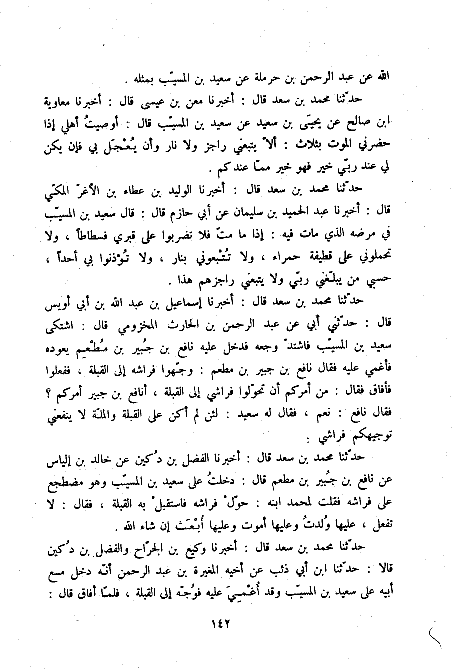 حَدَّثَنَا مُحَمَّدُ بْنُ سَعْدٍ قَالَ: أَخْبَرَنَا الْفَضْلُ بْنُ دُكَيْنٍ , عَنْ خَالِدِ بْنِ إِلْيَاسَ , عَنْ نَافِعِ بْنِ جُبَيْرِ بْنِ مُطْعِمٍ قَالَ: دَخَلْتُ عَلَى سَعِيدِ بْنِ الْمُسَيِّبِ وَهُوَ مُضْطَجِعٌ عَلَى فِرَاشِهِ , فَقُلْتُ لِمُحَمَّدٍ ابْنِهِ: حَوِّلْ فِرَاشَهُ , فَاسْتَقْبِلْ بِهِ الْقِبْلَةَ , فَقَالَ: لَا تَفْعَلْ؛ §عَلَيْهَا وُلِدْتُ , وَعَلَيْهَا أَمُوتُ , وَعَلَيْهَا أُبْعَثُ إِنْ شَاءَ اللَّهُ "