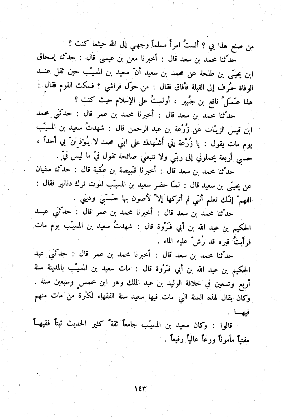 حَدَّثَنَا مُحَمَّدُ بْنُ سَعْدٍ قَالَ: أَخْبَرَنَا مُحَمَّدُ بْنُ عُمَرَ قَالَ: حَدَّثَنِي عَبْدُ الْحَكِيمِ بْنُ عَبْدِ اللَّهِ بْنِ أَبِي فَرْوَةَ , قَالَ §مَاتَ سَعِيدُ بْنُ الْمُسَيِّبِ بِالْمَدِينَةِ سَنَةَ أَرْبَعٍ وَتِسْعِينَ فِي خِلَافَةِ الْوَلِيدِ بْنِ عَبْدِ الْمَلِكِ وَهُوَ ابْنُ خَمْسٍ وَسَبْعِينَ سَنَةً , وَكَانَ يُقَالُ لِهَذِهِ السَّنَةِ الَّتِي مَاتَ فِيهَا سَعِيدٌ سَنَةُ الْفُقَهَاءِ لِكَثْرَةِ مَنْ مَاتَ مِنْهُمْ فِيهَا. قَالُوا: وَكَانَ سَعِيدُ بْنُ الْمُسَيِّبِ جَامِعًا , ثِقَةً , كَثِيرَ الْحَدِيثِ , ثَبْتًا , فَقِيهًا , مُفْتِيًا , مَأْمُونًا , وَرِعًا , عَالِيًا , رُفَيْعًا "