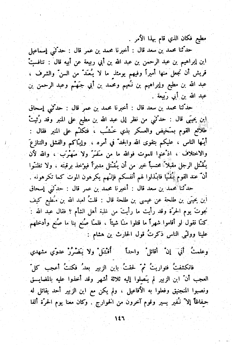 حَدَّثَنَا مُحَمَّدُ بْنُ سَعْدٍ قَالَ: أَخْبَرَنَا مُحَمَّدُ بْنُ عُمَرَ قَالَ: حَدَّثَنِي إِسْحَاقُ بْنُ يَحْيَى بْنِ طَلْحَةَ , عَنْ عِيسَى بْنِ طَلْحَةَ قَالَ: قُلْتُ لِعَبْدِ اللَّهِ بْنِ مُطِيعٍ: كَيْفَ نَجَوْتَ يَوْمَ الْحَرَّةِ , وَقَدْ رَأَيْتَ مَا رَأَيْتَ مِنْ غَلَبَةِ أَهْلِ الشَّامِ؟ فَقَالَ عَبْدُ اللَّهِ: كُنَّا نَقُولُ: §لَوْ أَقَامُوا شَهْرًا مَا قَتَلُوا مِنَّا شَيْئًا , فَلَمَّا صُنِعَ بِنَا مَا صُنِعَ , وَأُدْخِلُهُمْ عَلَيْنَا , وَوَلَّى النَّاسُ ذَكَرْتُ قَوْلَ الْحَارِثِ بْنِ هِشَامٍ: