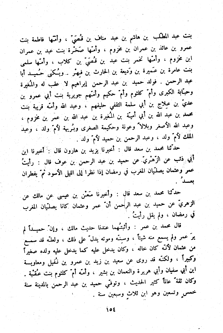 حَدَّثَنَا مُحَمَّدُ بْنُ سَعْدٍ قَالَ: وَأَخْبَرَنَا مَعْنُ بْنُ عِيسَى , عَنْ مَالِكٍ , عَنِ الزُّهْرِيِّ , عَنْ حُمَيْدِ بْنِ عَبْدِ الرَّحْمَنِ أَنَّ عُمَرَ وَعُثْمَانَ كَانَا §يُصَلِّيَانِ الْمَغْرِبَ فِي رَمَضَانَ , وَلَمْ يَقُلْ: رَأَيْتُ " قَالَ مُحَمَّدُ بْنُ عُمَرَ: وَأَثْبَتُهُمَا عِنْدَنَا حَدِيثُ مَالِكٍ وَإِنَّ حُمَيْدًا لَمْ يَرَ عُمَرَ , وَلَمْ يَسْمَعْ مِنْهُ شَيْئًا , وَسِنُّهُ وَمَوْتُهُ يَدُلُّ عَلَى ذَلِكَ , وَلَعَلَّهُ قَدْ سَمِعَ مِنَ عُثْمَانَ؛ لِأَنَّهُ كَانَ خَالَهُ , وَكَانَ يَدْخُلُ عَلَيْهِ كَمَا يَدْخُلُ عَلَيْهِ وَلَدُهُ صَغِيرًا وَكَبِيرًا , وَلَكِنَّهُ قَدْ رَوَى عَنْ سَعِيدِ بْنِ زَيْدِ بْنِ عَمْرِو بْنِ نُفَيْلٍ , وَمُعَاوِيَةَ بْنِ أَبِي سُفْيَانَ , وَأَبِي هُرَيْرَةَ , وَالنُّعْمَانِ بْنِ بَشِيرٍ وَأُمُّهُ أُمُّ كُلْثُومٍ بِنْتُ عُقْبَةَ , وَكَانَ ثِقَةً عَالِمًا كَثِيرَ الْحَدِيثِ , وَتُوُفِّيَ حُمَيْدُ بْنُ عَبْدِ الرَّحْمَنِ بِالْمَدِينَةِ سَنَةَ خَمْسٍ وَتِسْعِينَ وَهُوَ ابْنُ ثَلَاثٍ وَسَبْعِينَ سَنَةً