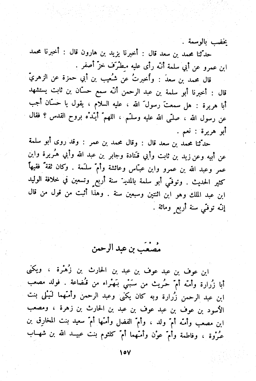 §مُصْعَبُ بْنُ عَبْدِ الرَّحْمَنِ بْنِ عَوْفِ بْنِ عَبْدِ عَوْفِ بْنِ عَبْدِ بْنِ الْحَارِثِ بْنِ زُهْرَةَ وَيُكَنَّى أَبَا زُرَارَةَ وَأُمُّهُ أُمُّ حُرَيْثٍ مِنْ سَبْيِ بَهْرَاءَ مِنْ قُضَاعَةَ , فَوَلَدَ مُصْعَبُ بْنُ عَبْدِ الرَّحْمَنِ زُرَارَةَ وَبِهِ كَانَ يُكْنَى , وَعَبْدَ الرَّحْمَنِ وَأُمُّهُمَا لَيْلَى بِنْتُ الْأَسْوَدِ بْنِ عَوْفِ بْنِ عَبْدِ عَوْفِ بْنِ عَبْدِ بْنِ الْحَارِثِ بْنِ زُهْرَةَ , وَمُصْعَبَ بْنَ مُصْعَبٍ وَأُمُّهُ أُمُّ وَلَدٍ , وَأُمَّ الْفَضْلِ وَأُمُّهَا أُمُّ سَعِيدٍ بِنْتُ الْمُخَارِقِ بْنِ عُرْوَةَ , وَفَاطِمَةَ , وَأُمَّ عَوْنٍ وَأُمُّهُمَا أُمُّ كُلْثُومٍ بِنْتُ عُبَيْدِ اللَّهِ بْنِ شِهَابِ -[158]- بْنِ عَبْدِ اللَّهِ بْنِ الْحَارِثِ بْنِ زُهْرَةَ قَالُوا: وَلَمَّا وَلِيَ مَرْوَانُ بْنُ الْحَكَمَ الْمَدِينَةَ فِي خِلَافَةِ مُعَاوِيَةَ فِي الْمَرَّةِ الثَّانِيَةِ اسْتَعْمَلَ مُصْعَبَ بْنَ عَبْدِ الرَّحْمَنِ بْنِ عَوْفِ عَلَى شُرَطِهِ , وَولَّاةَ قَضَاءَهُ بِالْمَدِينَةِ , وَكَانَ شَدِيدًا عَلَى الْمُرِيبِ وَكَانَ وُلَاةُ الْمَدِينَةِ هُمُ الَّذِينَ يَخْتَارُونَ الْقُضَاةَ , وَيُوَلُّونَهُمْ