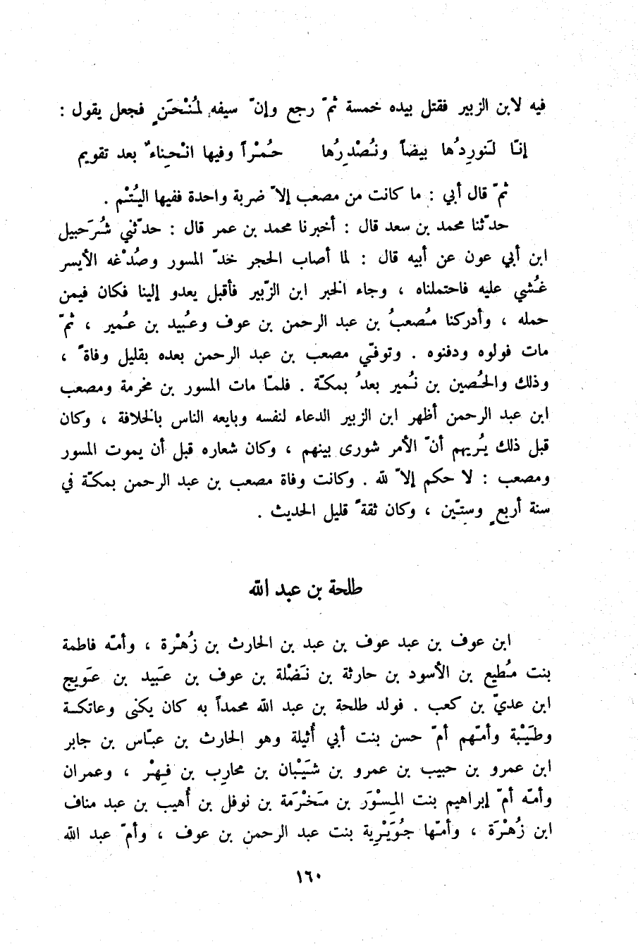 حَدَّثَنَا مُحَمَّدُ بْنُ سَعْدٍ قَالَ: أَخْبَرَنَا مُحَمَّدُ بْنُ عُمَرَ قَالَ: حَدَّثَنِي شُرَحْبِيلُ بْنُ أَبِي عَوْنٍ , عَنْ أَبِيهِ قَالَ: §لَمَّا أَصَابَ الْحَجَرُ خَدَّ الْمِسْوَرِ وَصُدْغَهُ الْأَيْسَرَ غُشِيَ عَلَيْهِ , فَاحْتَمَلْنَاهُ , وَجَاءَ الْخَبَرُ ابْنَ الزُّبَيْرِ , فَأَقْبَلَ يَعْدُو إِلَيْنَا , فَكَانَ فِيمَنْ حَمَلَهُ وَأَدْرَكَنَا مُصْعَبُ بْنُ عَبْدِ الرَّحْمَنِ بْنِ عَوْفٍ وَعُبَيْدُ بْنُ عُمَيْرٍ , ثُمَّ مَاتَ , فَوَلُّوهُ , وَدَفَنُوهُ , وَتُوُفِّيَ مُصْعَبُ بْنُ عَبْدِ الرَّحْمَنِ بَعْدَهُ بِقَلِيلٍ وَفَاةً , وَذَلِكَ وَالْحُصَيْنُ بْنُ نُمَيْرٍ بَعْدُ بِمَكَّةَ , فَلَمَّا مَاتَ الْمِسْوَرُ بْنُ مَخْرَمَةَ وَمُصْعَبُ بْنُ عَبْدِ الرَّحْمَنِ أَظْهَرَ ابْنُ الزُّبَيْرِ الدُّعَاءَ لِنَفْسِهِ وَبَايَعَهُ النَّاسُ بِالْخِلَافَةِ , وَكَانَ قَبْلَ ذَلِكَ يُرِيَهُمْ أَنَّ الْأَمْرَ شُورَى بَيْنَهُمْ , وَكَانَ شِعَارُهُ قَبْلَ أَنْ يَمُوتَ الْمِسْوَرُ وَمُصْعَبُ لَا حُكْمَ إِلَّا لِلَّهِ " وَكَانَتْ وَفَاةُ مُصْعَبِ بْنِ عَبْدِ الرَّحْمَنِ بِمَكَّةَ فِي سَنَةِ أَرْبَعٍ وَسِتِّينَ , وَكَانَ ثِقَةً قَلِيلَ الْحَدِيثِ