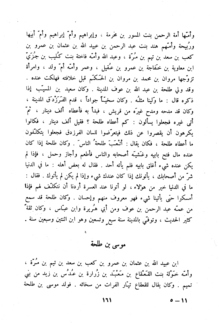 وَأُمُّهَا أَمَةُ الرَّحْمَنِ بِنْتُ الْمِسْوَرِ بْنِ مَخْرَمَةِ , وَإِبْرَاهِيمَ , وَأُمَّ إِبْرَاهِيمَ , وَأُمَّ أَبِيهَا , وَرَبِيحَةَ وَأُمُّهُمْ هِنْدُ بِنْتُ عَبْدِ الرَّحْمَنِ بْنِ عُبَيْدِ اللَّهِ بْنِ عُثْمَانَ بْنِ عَمْرِو بْنِ كَعْبِ بْنِ سَعْدِ بْنِ تَيْمِ بْنِ مُرَّةَ , وَعَبْدَ اللَّهِ وَأُمُّهُ فَاخِتَةُ بِنْتُ كُلَيْبِ بْنِ جُزَيِّ بْنِ مُعَاوِيَةَ بْنِ خَفَاجَةَ بْنِ عَمْرِو بْنِ عَقِيلٍ , وَعُمَرَ وَأُمُّهُ أُمُّ وَلَدٍ , وَامْرَأَةٌ تَزَوَّجَهَا مَرْوَانُ بْنُ مُحَمَّدِ بْنِ مَرْوَانَ بْنِ الْحَكَمِ قَبْلَ خِلَافَتِهِ فَهَلَكَتْ عِنْدَهُ , وَقَدْ وَلِيَ طَلْحَةُ بْنُ عَبْدِ اللَّهِ بْنِ عَوْفٍ الْمَدِينَةَ , وَكَانَ سَعِيدُ بْنُ الْمُسَيِّبِ إِذَا ذَكَرَهُ قَالَ: مَا وُلِّينَا مِثْلَهُ , وَكَانَ سَخِيًّا , جَوَادًا. قَدِمَ الْفَرَزْدَقُ الْمَدِينَةَ , وَكَانَ قَدْ مَدْحَهُ وَمَدَحَ غَيْرَهُ مِنْ قُرَيْشٍ فَبَدَأَ بِهِ فَأَعْطَاهُ أَلْفَ دِينَارٍ , ثُمَّ أَتَى غَيْرَهُ , فَجَعَلُوا يَسْأَلُونَ: كَمْ أَعْطَاهُ طَلْحَةُ؟ فَقِيلَ: أَلْفَ دِينَارٍ , فَكَانُوا يَكْرَهُونَ أَنْ يُقَصِّرُوا عَنْ ذَلِكَ فَيَتَعَرَّضُوا لِلِسَانِ الْفَرَزْدَقِ , فَجَعَلُوا يَتَكَلَّفُونَ مَا أَعْطَاهُ طَلْحَةُ , فَكَانَ يُقَالُ: أَتْعَبَ طَلْحَةُ النَّاسَ , وَكَانَ طَلْحَةُ إِذَا كَانَ عِنْدَهُ مَالٌ فَتَحَ بَابَيْهِ وَغَشِيَهُ أَصْحَابُهُ وَالنَّاسُ فَأَطْعَمَ وَأَجَازَ وَحَمَلَ , فَإِذَا لَمْ يَكُنْ عِنْدَهُ شَيْءٌ أَغْلَقَ بَابَيْهِ , فَلَمْ يَأْتِهِ أَحَدٌ , فَقَالَ لَهُ بَعْضُ أَهْلِهِ: مَا فِي الدُّنْيَا شَرٌّ مِنْ أَصْحَابِكَ؛ يَأْتُونَكَ إِذَا كَانَ عِنْدَكَ شَيْءٌ , وَإِذَا لَمْ يَكُنْ لَمْ يَأْتُوكَ فَقَالَ: مَا فِي الدُّنْيَا خَيْرٌ مِنْ هَؤُلَاءِ لَوْ أَتَوْنَا عِنْدَ الْعُسْرَةِ أَرَدْنَا أَنْ نَتَكَلَّفَ لَهُمْ , فَإِذَا أَمْسَكُوا حَتَّى يَأْتِيَنَا شَيْءٌ فَهُوَ مَعْرُوفٌ مِنْهُمْ وَإِحْسَانٌ. وَكَانَ طَلْحَةُ قَدْ سَمِعَ مِنْ عَمِّهِ عَبْدِ الرَّحْمَنِ بْنِ عَوْفٍ وَمِنْ أَبِي هُرَيْرَةَ , وَابْنِ عَبَّاسٍ , وَكَانَ ثِقَةً كَثِيرَ الْحَدِيثِ وَتُوُفِّيَ بِالْمَدِينَةِ سَنَةَ سَبْعٍ وَتِسْعِينَ , وَهُوَ ابْنُ اثْنَتَيْنِ وَسَبْعِينَ سَنَةً