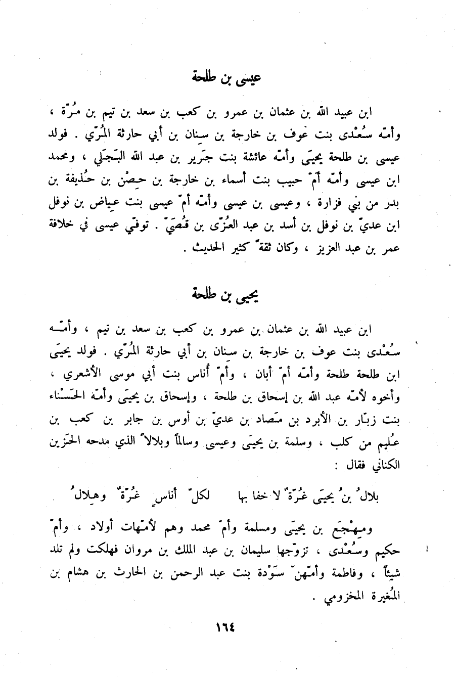 §يَحْيَى بْنُ طَلْحَةَ بْنِ عُبَيْدِ اللَّهِ بْنِ عُثْمَانَ بْنِ عَمْرِو بْنِ كَعْبِ بْنِ سَعْدِ بْنِ تَيْمٍ وَأُمُّهُ سُعْدَى بِنْتُ عَوْفِ بْنِ خَارِجَةَ بْنِ سِنَانِ بْنِ أَبِي حَارِثَةَ الْمُرِّيِّ , فَوَلَدَ يَحْيَى بْنُ طَلْحَةَ طَلْحَةَ وَأُمُّهُ أُمُّ أَبَانَ , وَأُمُّ أُنَاسٍ بِنْتُ أَبِي مُوسَى الْأَشْعَرِيِّ , وَأَخُوهُ لِأُمِّهِ عَبْدُ اللَّهِ بْنُ إِسْحَاقَ بْنِ طَلْحَةَ , وَإِسْحَاقَ بْنَ يَحْيَى وَأُمُّهُ الْحَسْنَاءُ بِنْتُ زَبَّارِ بْنِ الْأَبْرَدِ بْنِ مَصَادِ بْنِ عَدِيِّ بْنِ أَوْسِ بْنِ جَابِرِ بْنِ كَعْبِ بْنِ عَلِيمِ مِنْ كَلْبٍ , وَسَلَمَةَ بْنَ يَحْيَى , وَعِيسَى , وَسَالِمًا , وَبِلَالًا الَّذِي مَدْحَهُ الْحَزِينُ الْكِنَانِيُّ , فَقَالَ: