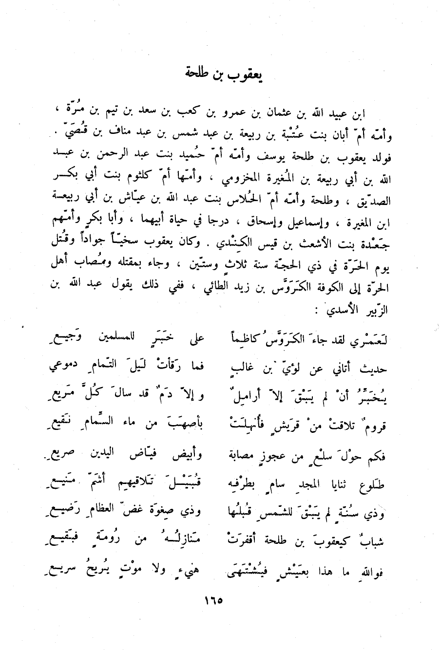 شَبَابٌ كَيَعْقُوبَ بْنِ طَلْحَةَ أَقْفَرَتْ ... مَنَازِلُهُ مِنْ رُومَةٍ فَبَقِيعِ