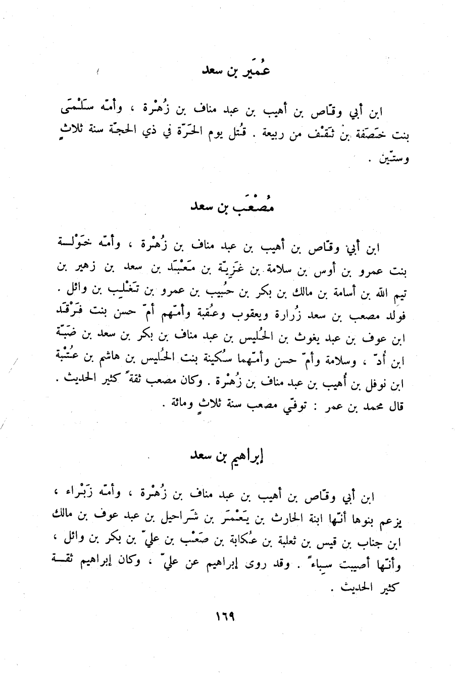 §مُصْعَبُ بْنُ سَعْدِ بْنِ أَبِي وَقَّاصِ بْنِ أُهَيْبِ بْنِ عَبْدِ مَنَافِ بْنِ زُهْرَةَ وَأُمُّهُ خَوْلَةُ بِنْتُ عَمْرِو بْنِ أَوْسِ بْنِ سَلَامَةَ بْنِ غَزِيَّةَ بْنِ مَعْبَدِ بْنِ سَعْدِ بْنِ زُهَيْرِ بْنِ تَيْمِ اللَّهِ بْنِ أُسَامَةَ بْنِ مَالِكِ بْنِ بَكْرِ بْنِ حَبِيبِ بْنِ عَمْرِو بْنِ تَغْلِبَ بْنِ وَائِلٍ , فَوَلَدَ مُصْعَبُ بْنُ سَعْدٍ زُرَارَةَ , وَيَعْقُوبَ , وَعُقْبَةَ وَأُمُّهُمْ أُمُّ حَسَنٍ بِنْتُ فَرْقَدِ بْنِ عَوْفِ بْنِ عَبْدِ يَغُوثَ بْنِ الْحُلَيْسِ بْنِ عَبْدِ مَنَافِ بْنِ بَكْرِ بْنِ سَعْدِ بْنِ ضَبَّةَ بْنِ أُدٍّ , وَسَلَامَةَ , وَأُمَّ حَسَنٍ وَأُمُّهُمَا سَكِينَةُ بِنْتُ الْحُلَيْسِ بْنِ هَاشِمِ بْنِ عُتْبَةَ بْنِ نَوْفَلِ بْنِ أُهَيْبِ بْنِ عَبْدِ مَنَافِ بْنِ زُهْرَةَ , وَكَانَ مُصْعَبٌ ثِقَةً كَثِيرَ الْحَدِيثِ. قَالَ مُحَمَّدُ بْنُ عُمَرَ: تُوُفِّيَ مُصْعَبٌ سَنَةَ ثَلَاثٍ وَمِائَةٍ