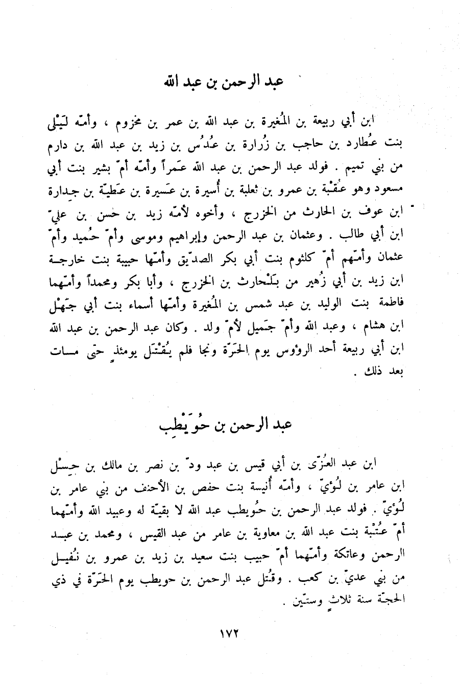 §عَبْدُ الرَّحْمَنِ بْنُ عَبْدِ اللَّهِ بْنِ أَبِي رَبِيعَةَ بْنِ الْمُغِيرَةِ بْنِ عَبْدِ اللَّهِ بْنِ عُمَرَ بْنِ مَخْزُومٍ وَأُمُّهُ لَيْلَى بِنْتُ عُطَارِدِ بْنِ حَاجِبِ بْنِ زُرَارَةَ بْنِ عُدُسِ بْنِ زَيْدِ بْنِ عَبْدِ اللَّهِ بْنِ دَارِمٍ مِنْ بَنِي تَمِيمٍ , فَوَلَدَ عَبْدُ الرَّحْمَنِ بْنُ عَبْدِ اللَّهِ عَمْرًا وَأُمُّهُ أُمُّ بَشِيرٍ بِنْتُ أَبِي مَسْعُودٍ وَهُوَ عُقْبَةُ بْنُ عَمْرِو بْنِ ثَعْلَبَةَ بْنِ أَسِيرَةَ بْنِ عَسِيرَةَ بْنِ عَطِيَّةَ بْنِ جِدَارَةَ بْنِ عَوْفِ بْنِ الْحَارِثِ مِنَ الْخَزْرَجِ , وَأَخُوهُ لِأُمِّهِ زَيْدُ بْنُ حَسَنِ بْنِ عَلِيِّ بْنِ أَبِي طَالِبٍ , وَعُثْمَانَ بْنَ عَبْدِ الرَّحْمَنِ , وَإِبْرَاهِيمَ , وَمُوسَى , وَأُمَّ حُمَيْدٍ , وَأُمَّ عُثْمَانَ وَأُمُّهُمْ أُمُّ كُلْثُومٍ بِنْتُ أَبِي بَكْرٍ الصِّدِّيقِ وَأُمُّهَا حَبِيبَةُ بِنْتُ خَارِجَةَ بْنِ زَيْدِ بْنِ أَبِي زُهَيْرٍ مِنْ بَلْحَارِثِ بْنِ الْخَزْرَجِ , وَأَبَا بَكْرٍ , وَمُحَمَّدًا وَأُمُّهُمَا فَاطِمَةُ بِنْتُ الْوَلِيدِ بْنِ عَبْدِ شَمْسِ بْنِ الْمُغِيرَةِ وَأُمُّهَا أَسْمَاءُ بِنْتُ أَبِي جَهْلِ بْنِ هِشَامٍ , وَعَبْدَ اللَّهِ , وَأُمَّ جَمِيلٍ لِأُمِّ وَلَدٍ , وَكَانَ عَبْدُ الرَّحْمَنِ بْنُ عَبْدِ اللَّهِ بْنِ أَبِي رَبِيعَةَ أَحَدُ الرُّءُوسِ يَوْمَ الْحَرَّةِ , وَنَجَا , فَلَمْ يُقْتَلْ يَوْمَئِذٍ حَتَّى مَاتَ بَعْدَ ذَلِكَ
