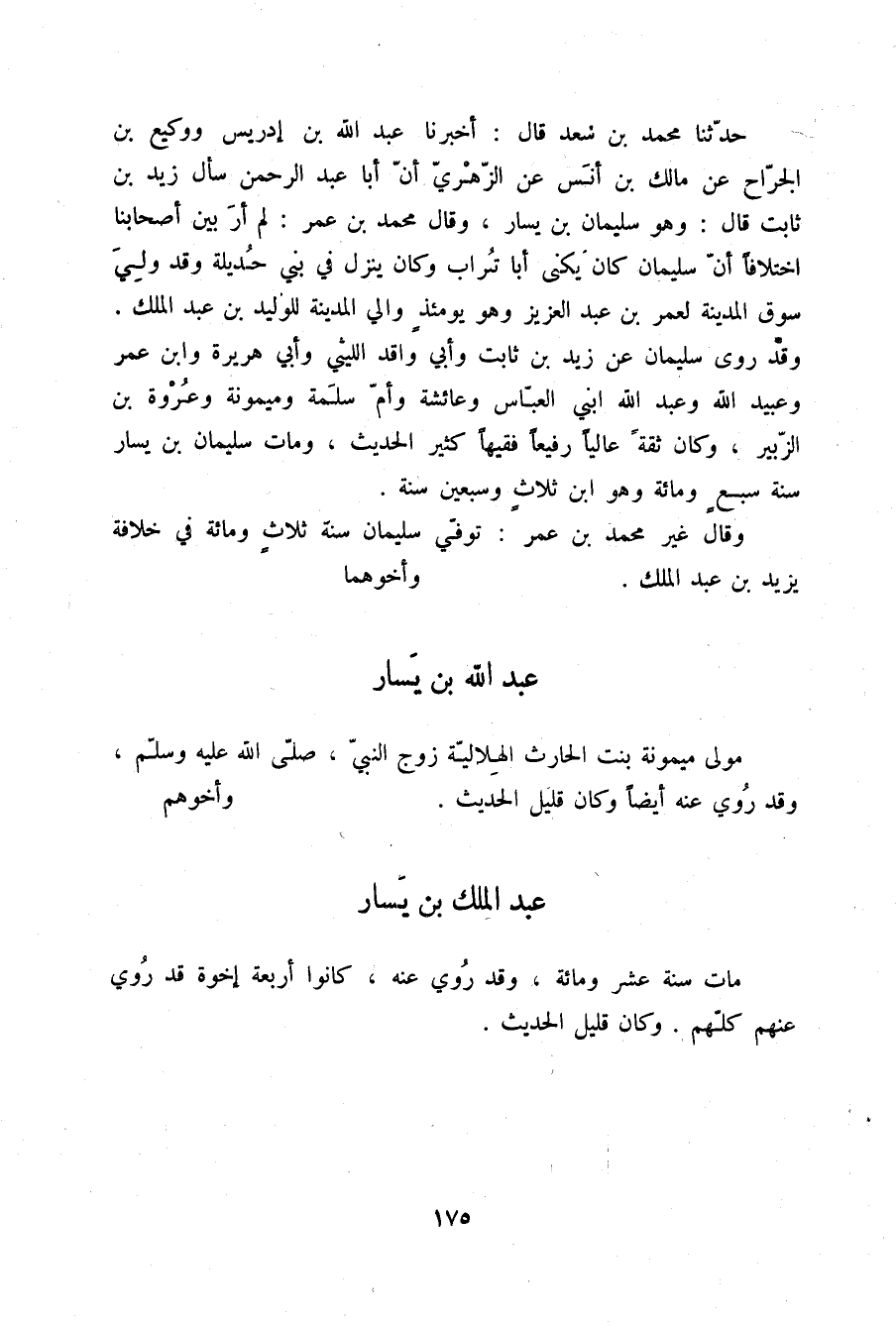 حَدَّثَنَا مُحَمَّدُ بْنُ سَعْدٍ قَالَ: أَخْبَرَنَا عَبْدُ اللَّهِ بْنُ إِدْرِيسَ وَوَكِيعُ بْنُ الْجَرَّاحِ , عَنْ مَالِكِ بْنِ أَنَسٍ , عَنِ الزُّهْرِيِّ أَنَّ أَبَا عَبْدِ الرَّحْمَنِ سَأَلَ زَيْدَ بْنَ ثَابِتٍ قَالَ: وَهُوَ سُلَيْمَانُ بْنُ يَسَارٍ , وَقَالَ مُحَمَّدُ بْنُ عُمَرَ: §لَمْ أَرَ بَيْنَ أَصْحَابِنَا اخْتِلَافًا أَنَّ سُلَيْمَانَ كَانَ يُكْنَى أَبَا تُرَابٍ , وَكَانَ يَنْزِلُ فِي بَنِي حُدَيْلَةَ , وَقَدْ وَلِيَ سُوقَ الْمَدِينَةِ لِعُمَرَ بْنِ عَبْدِ الْعَزِيزِ وَهُوَ يَوْمَئِذٍ وَالِي الْمَدِينَةِ لِلْوَلِيدِ بْنِ عَبْدِ الْمَلِكِ " وَقَدْ رَوَى سُلَيْمَانُ عَنْ زَيْدِ بْنِ ثَابِتٍ , وَأَبِي وَاقِدٍ اللَّيْثِيِّ , وَأَبِي هُرَيْرَةَ , وَابْنِ عُمَرَ , وَعُبَيْدِ اللَّهِ وَعَبْدِ اللَّهِ ابْنَيِ الْعَبَّاسِ , وَعَائِشَةَ , وَأُمِّ سَلَمَةَ , وَمَيْمُونَةَ , وَعُرْوَةَ بْنِ الزُّبَيْرِ. وَكَانَ ثِقَةً عَالِيًا رُفَيْعًا فَقِيهًا , كَثِيرَ الْحَدِيثِ. وَمَاتَ سُلَيْمَانُ بْنُ يَسَارٍ سَنَةَ سَبْعٍ وَمِائَةٍ وَهُوَ ابْنُ ثَلَاثٍ وَسَبْعِينَ سَنَةً. وَقَالَ غَيْرُ مُحَمَّدِ بْنِ عُمَرَ تُوُفِّيَ سُلَيْمَانُ سَنَةَ ثَلَاثٍ وَمِائَةٍ فِي خِلَافَةِ يَزِيدَ بْنِ عَبْدِ الْمَلِكِ