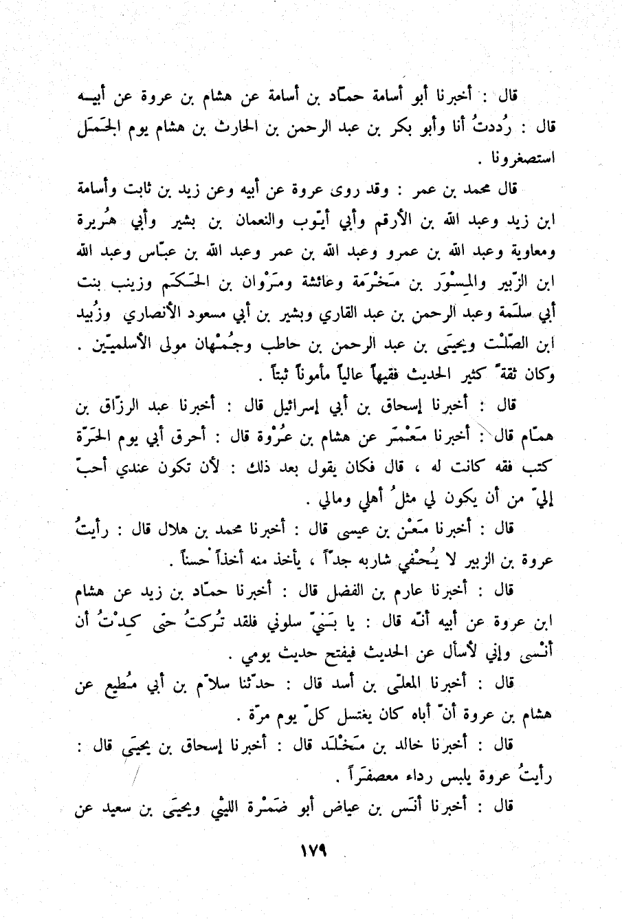 قَالَ أَخْبَرَنَا إِسْحَاقُ بْنُ أَبِي إِسْرَائِيلَ قَالَ: أَخْبَرَنَا عَبْدُ الرَّزَّاقِ بْنُ هَمَّامٍ قَالَ: أَخْبَرَنَا مَعْمَرٌ , عَنْ هِشَامِ بْنِ عُرْوَةَ قَالَ: §أَحْرَقَ أَبِي يَوْمَ الْحَرَّةِ كُتُبَ فِقْهٍ كَانَتْ لَهُ. قَالَ: فَكَانَ يَقُولُ بَعْدَ ذَلِكَ لَأَنْ تَكُونَ عِنْدِي أَحَبُّ إِلَيَّ مِنْ أَنْ يَكُونَ لِي مِثْلُ أَهْلِي وَمَالِي "