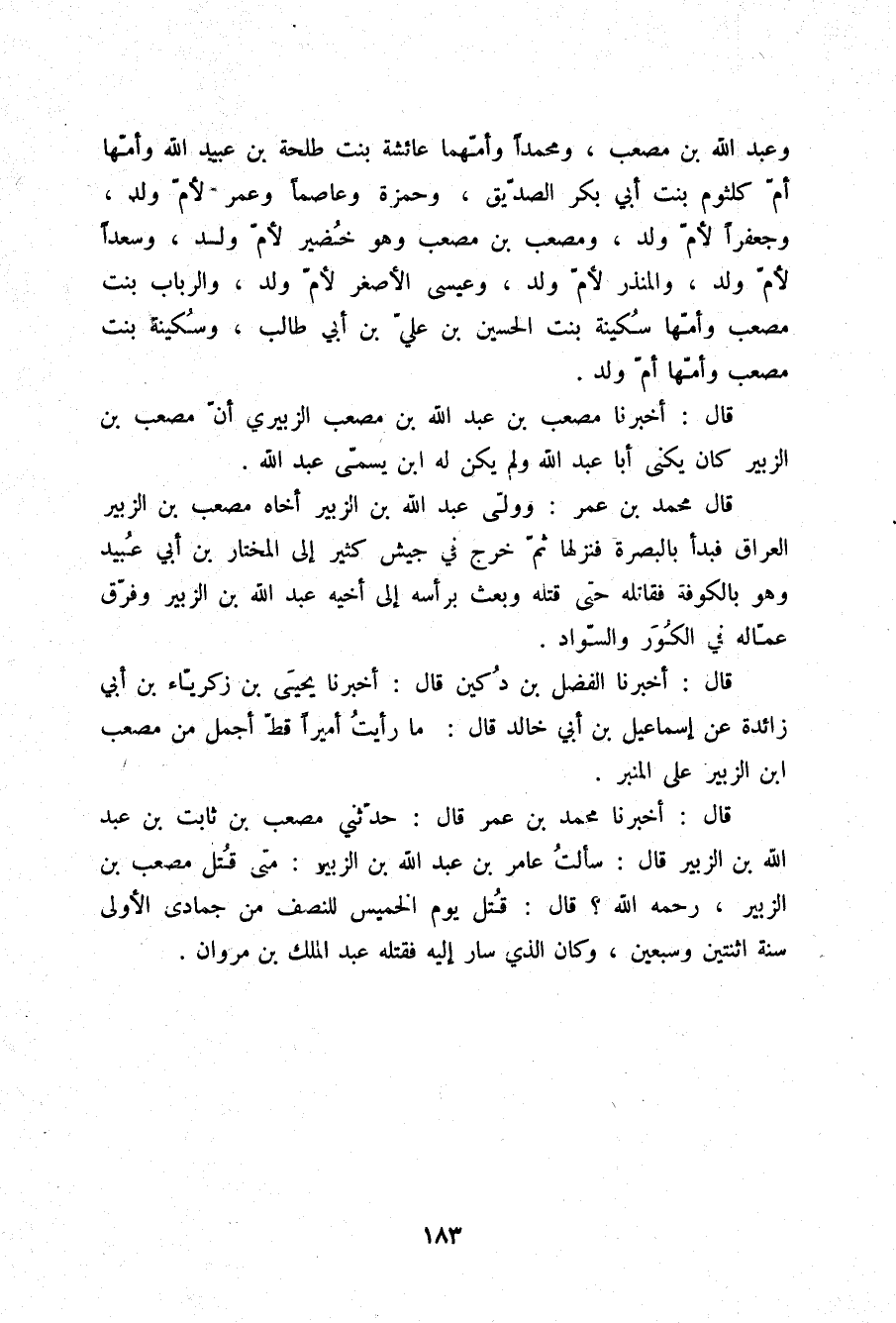 وَعَبْدَ اللَّهِ بْنَ مُصْعَبٍ , وَمُحَمَّدًا وَأُمُّهُمَا عَائِشَةُ بِنْتُ طَلْحَةَ بْنِ عُبَيْدِ اللَّهِ وَأُمُّهَا أُمُّ كُلْثُومٍ بِنْتُ أَبِي بَكْرٍ الصِّدِّيقِ , وَحَمْزَةَ , وَعَاصِمًا , وَعُمَرَ لِأُمِّ وَلَدٍ , وَجَعْفَرًا لِأُمِّ وَلَدٍ , وَمُصْعَبَ بْنَ مُصْعَبٍ وَهُوَ خُضَيْرٌ لِأُمِّ وَلَدٍ , وَسَعْدًا لِأُمِّ وَلَدٍ , وَالْمُنْذِرَ لِأُمِّ وَلَدٍ , وَعِيسَى الْأَصْغَرَ لِأُمِّ وَلَدٍ , وَالرَّبَابَ بِنْتَ مُصْعَبٍ وَأُمُّهَا سُكَيْنَةُ بِنْتُ الْحُسَيْنِ بْنِ عَلِيِّ بْنِ أَبِي طَالِبٍ , وَسُكَيْنَةَ بِنْتَ مُصْعَبٍ وَأُمُّهَا أُمُّ وَلَدٍ. قَالَ: أَخْبَرَنَا مُصْعَبُ بْنُ عَبْدِ اللَّهِ بْنِ مُصْعَبٍ الزُّبَيْرِيُّ «أَنَّ مُصْعَبَ بْنَ الزُّبَيْرِ كَانَ يُكْنَى أَبَا عَبْدِ اللَّهِ , وَلَمْ يَكُنْ لَهُ ابْنٌ يُسَمَّى عَبْدَ اللَّهِ» قَالَ مُحَمَّدُ بْنُ عُمَرَ: وَوَلَّى عَبْدُ اللَّهِ بْنُ الزُّبَيْرِ أَخَاهُ مُصْعَبَ بْنَ الزُّبَيْرِ الْعِرَاقَ , فَبَدَأَ بِالْبَصْرَةِ , فَنَزَلَهَا , ثُمَّ خَرَجَ فِي جَيْشٍ كَثِيرٍ إِلَى الْمُخْتَارِ بْنِ أَبِي عُبَيْدٍ وَهُوَ بِالْكُوفَةِ , فَقَاتَلَهُ حَتَّى قَتَلَهُ , وَبَعَثَ بِرَأْسِهِ إِلَى أَخِيهِ عَبْدِ اللَّهِ بْنِ الزُّبَيْرِ , وَفَرَّقَ عُمَّالَهُ فِي الْكُوَرِ وَالسَّوَادِ