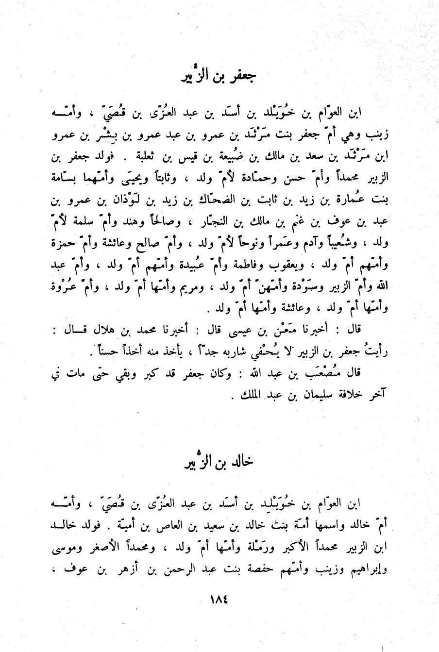 §خَالِدُ بْنُ الزُّبَيْرِ بْنِ الْعَوَّامِ بْنِ خُوَيْلِدِ بْنِ أَسَدِ بْنِ عَبْدِ الْعُزَّى بْنِ قُصَيٍّ وَأُمُّهُ أُمُّ خَالِدٍ وَاسْمُهَا أَمَةُ بِنْتُ خَالِدِ بْنِ سَعِيدِ بْنِ الْعَاصِ بْنِ أُمَيَّةَ , فَوَلَدَ خَالِدُ بْنُ الزُّبَيْرِ مُحَمَّدًا الْأَكْبَرَ , وَرَمْلَةَ وَأُمُّهَا أُمُّ وَلَدٍ , وَمُحَمَّدًا الْأَصْغَرَ , وَمُوسَى , وَإِبْرَاهِيمَ , وَزَيْنَبَ وَأُمُّهُمْ حَفْصَةُ بِنْتُ عَبْدِ الرَّحْمَنِ بْنِ أَزْهَرَ بْنِ عَوْفٍ , -[185]- وَسُلَيْمَانَ بْنَ خَالِدٍ , وَأُمَّ سُلَيْمَانَ وَأُمُّهُمَا أُمُّ مُحَمَّدٍ بِنْتُ عَبْدِ اللَّهِ بْنِ عَمْرِو بْنِ الْحُصَيْنِ ذِي الْغُصَّةِ الْحَارِثِيِّ , وَنَبِيهَ بْنَ خَالِدٍ , وَهُمَيْنَةَ وَأُمُّهُمَا أُمُّ وَلَدٍ , وَخَالِدَ بْنَ خَالِدٍ , وَهِنْدَ وَأُمُّهُمَا أُمُّ وَلَدٍ , وَأُمَّ عَمْرٍو بِنْتَ خَالِدٍ لِأُمِّ وَلَدٍ