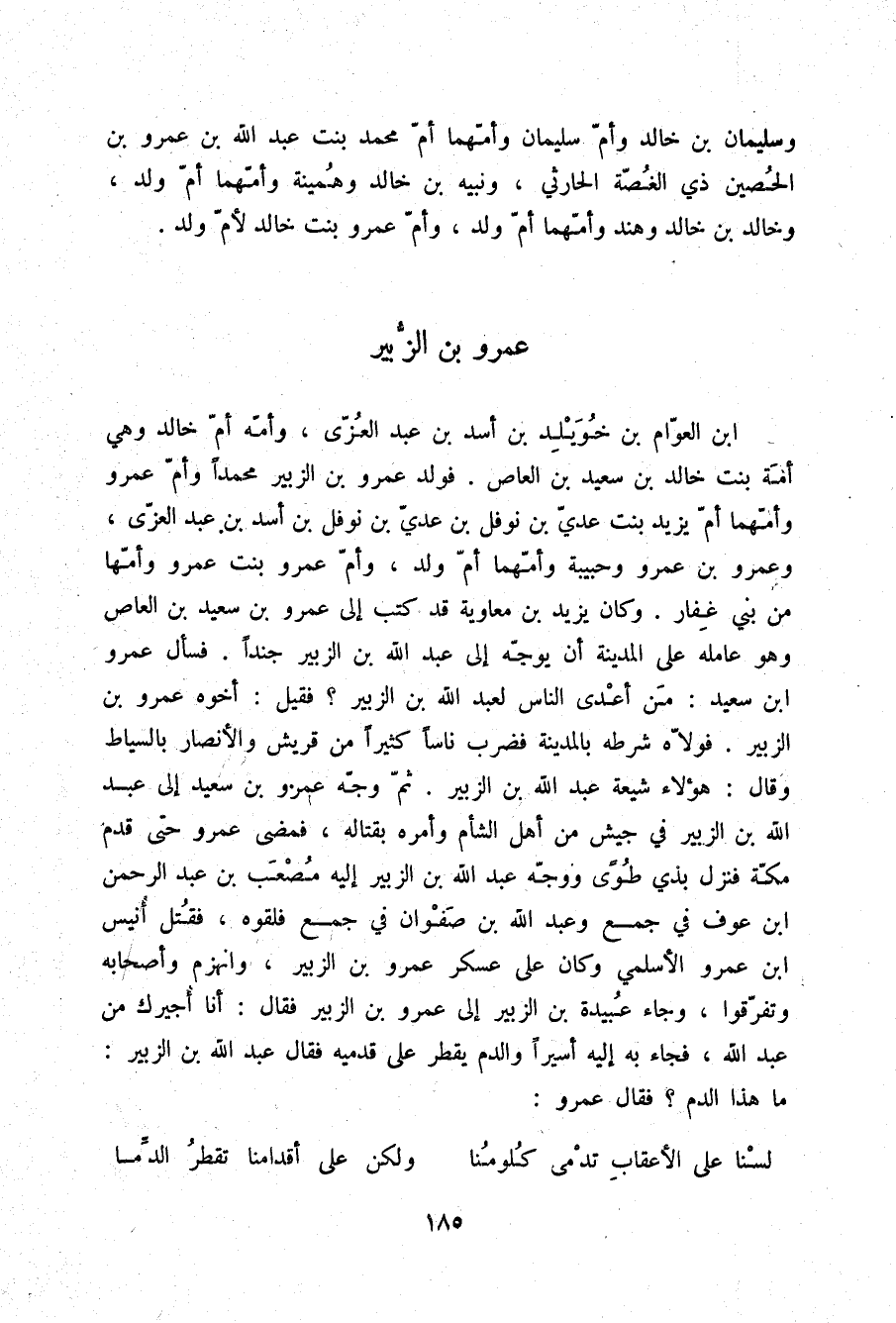 §عَمْرُو بْنُ الزُّبَيْرِ بْنِ الْعَوَّامِ بْنِ خُوَيْلِدِ بْنِ أَسَدِ بْنِ عَبْدِ الْعُزَّى وَأُمُّهُ أُمُّ خَالِدٍ وَهِيَ أَمَةُ بِنْتُ خَالِدِ بْنِ سَعِيدِ بْنِ الْعَاصِ , فَوَلَدَ عَمْرُو بْنُ الزُّبَيْرِ مُحَمَّدًا , وَأُمَّ عَمْرٍو وَأُمُّهُمَا أُمُّ يَزِيدَ بِنْتُ عَدِيِّ بْنِ نَوْفَلِ بْنِ عَدِيِّ بْنِ نَوْفَلِ بْنِ أَسَدِ بْنِ عَبْدِ الْعُزَّى , وَعَمْرَو بْنَ عَمْرٍو , وَحَبِيبَةَ وَأُمُّهُمَا أُمُّ وَلَدٍ , وَأُمَّ عَمْرٍو بِنْتَ عَمْرٍو وَأُمُّهَا مِنْ بَنِي غِفَارٍ , وَكَانَ يَزِيدُ بْنُ مُعَاوِيَةَ قَدْ كَتَبَ إِلَى عَمْرِو بْنِ سَعِيدِ بْنِ الْعَاصِ وَهُوَ عَامِلُهُ عَلَى الْمَدِينَةِ أَنْ يُوَجِّهَ إِلَى عَبْدِ اللَّهِ بْنِ الزُّبَيْرِ جُنْدًا , فَسَأَلَ عَمْرُو بْنُ سَعِيدٍ: مَنْ أَعْدَى النَّاسِ لِعَبْدِ اللَّهِ بْنِ الزُّبَيْرِ؟ فَقِيلَ: أَخُوهُ عَمْرُو بْنُ الزُّبَيْرِ؛ فَوَلَّاهُ شُرَطَهُ بِالْمَدِينَةِ , فَضَرَبَ نَاسًا كَثِيرًا مِنْ قُرَيْشٍ وَالْأَنْصَارِ بِالسِّيَاطِ , وَقَالَ: هَؤُلَاءِ شِيعَةُ عَبْدِ اللَّهِ بْنِ الزُّبَيْرِ , ثُمَّ وَجَّهَ عَمْرَو بْنَ سَعِيدٍ إِلَى عَبْدِ اللَّهِ بْنِ الزُّبَيْرِ فِي جَيْشٍ مِنْ أَهْلِ الشَّامِ , وَأَمَرَهُ بِقِتَالِهِ , فَمَضَى عَمْرٌو حَتَّى قَدِمَ مَكَّةَ , فَنَزَلَ بِذِي طُوًى وَوَجَّهَ عَبْدُ اللَّهِ بْنُ الزُّبَيْرِ إِلَيْهِ مُصْعَبَ بْنَ عَبْدِ الرَّحْمَنِ بْنِ عَوْفٍ فِي جَمْعٍ وَعَبْدَ اللَّهِ بْنَ صَفْوَانَ فِي جَمْعٍ , فَلَقُوهُ , فَقُتِلَ أُنَيْسُ بْنُ عَمْرٍو الْأَسْلَمِيُّ وَكَانَ عَلَى عَسْكَرِ عَمْرِو بْنِ الزُّبَيْرِ , وَانْهَزَمَ وَأَصْحَابُهُ , وَتَفَرَّقُوا. وَجَاءَ عُبَيْدَةُ بْنُ الزُّبَيْرِ إِلَى عَمْرِو بْنِ الزُّبَيْرِ , فَقَالَ: أَنَا أُجِيرُكَ مِنْ عَبْدِ اللَّهِ , فَجَاءَ بِهِ إِلَيْهِ أَسِيرًا وَالدَّمُ يَقْطُرُ عَلَى قَدَمَيْهِ , فَقَالَ عَبْدُ اللَّهِ بْنُ الزُّبَيْرِ: مَا هَذَا الدَّمُ؟ فَقَالَ عَمْرٌو: