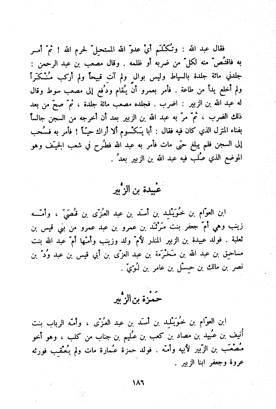 §حَمْزَةُ بْنُ الزُّبَيْرِ بْنِ الْعَوَّامِ بْنِ خُوَيْلِدِ بْنِ أَسَدِ بْنِ عَبْدِ الْعُزَّى وَأُمُّهُ الرَّبَابُ بِنْتُ أُنَيْفِ بْنِ عُبَيْدِ بْنِ مَصَادِ بْنِ كَعْبِ بْنِ عُلَيْمِ بْنِ جَنَابٍ مِنْ كَلْبٍ وَهُوَ أَخُو مُصْعَبِ بْنِ الزُّبَيْرِ لِأَبِيهِ وَأُمِّهِ , فَوَلَدَ حَمْزَةُ عُمَارَةَ مَاتَ وَلَمْ يُعْقِبْ , فَوَرِثَهُ عُرْوَةُ وَجَعْفَرٌ ابْنَا الزُّبَيْرِ