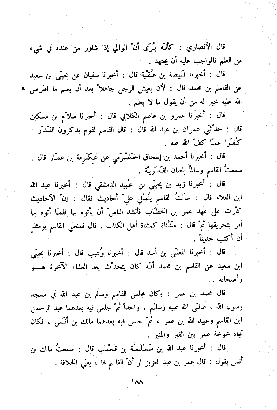 قَالَ أَخْبَرَنَا زَيْدُ بْنُ يَحْيَى بْنِ عُبَيْدٍ الدِّمَشْقِيُّ قَالَ: أَخْبَرَنَا عَبْدُ اللَّهِ بْنُ الْعَلَاءِ قَالَ: سَأَلْتُ الْقَاسِمَ يُمْلِي عَلَيَّ أَحَادِيثَ , فَقَالَ: §إِنَّ الْأَحَادِيثَ كَثُرَتْ عَلَى عَهْدِ عُمَرَ بْنِ الْخَطَّابِ , فَأَنْشَدَ النَّاسَ أَنْ يَأْتُوهُ بِهَا , فَلَمَّا أَتَوْهُ بِهَا أَمَرَ بِتَحْرِيقِهَا , ثُمَّ قَالَ: مَثْنَاةٌ كَمَثْنَاةِ أَهْلِ الْكِتَابِ. قَالَ: فَمَنَعَنِي الْقَاسِمُ يَوْمَئِذٍ أَنْ أَكْتُبَ حَدِيثًا "
