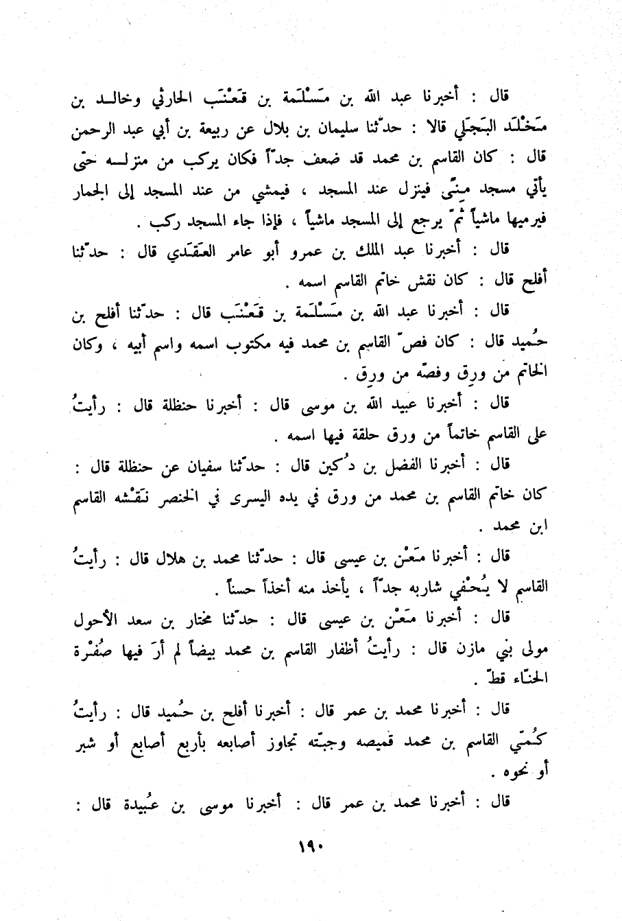 قَالَ أَخْبَرَنَا عَبْدُ اللَّهِ بْنُ مَسْلَمَةَ بْنِ قَعْنَبٍ قَالَ: حَدَّثَنَا أَفْلَحُ بْنُ حُمَيْدٍ قَالَ: كَانَ فَصُّ الْقَاسِمِ بْنِ مُحَمَّدٍ فِيهِ §مَكْتُوبٌ اسْمُهُ وَاسْمُ أَبِيهِ , وَكَانَ الْخَاتَمُ مِنْ وَرِقٍ وَفَصُّهُ مِنْ وَرِقِ "