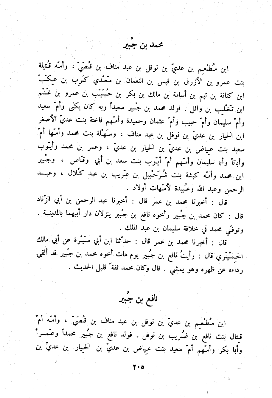 §مُحَمَّدُ بْنُ جُبَيْرِ بْنِ مُطْعِمِ بْنِ عَدِيِّ بْنِ نَوْفَلِ بْنِ عَبْدِ مَنَافِ بْنِ قُصَيٍّ وَأُمُّهُ قُتَيْلَةُ بِنْتُ عَمْرِو بْنِ الْأَزْرَقِ بْنِ قَيْسِ بْنِ النُّعْمَانِ بْنِ مَعْدِي كَرِبَ بْنِ عِكَبِّ بْنِ كِنَانَةَ بْنِ تَيْمِ بْنِ أُسَامَةَ بْنِ مَالِكِ بْنِ بَكْرِ بْنِ حَبِيبِ بْنِ عَمْرِو بْنِ غَنْمِ بْنِ تَغْلِبَ بْنِ وَائِلٍ , فَوَلَدَ مُحَمَّدُ بْنُ جُبَيْرٍ سَعِيدًا وَبِهِ كَانَ يُكْنَى , وَأُمَّ سَعِيدٍ , وَأُمَّ سُلَيْمَانَ , وَأُمَّ حَبِيبٍ , وَأُمَّ عُثْمَانَ , وَحُمَيْدَةَ وَأُمُّهُمْ فَاخِتَةُ بِنْتُ عَدِيِّ الْأَصْغَرِ ابْنِ الْخِيَارِ بْنِ عَدِيِّ بْنِ نَوْفَلِ بْنِ عَبْدِ مَنَافٍ , وَسَهْلَةَ بِنْتَ مُحَمَّدٍ وَأُمُّهَا أُمُّ سَعِيدٍ بِنْتُ عِيَاضِ بْنِ عَدِيِّ بْنِ الْخِيَارِ بْنِ عَدِيٍّ , وَعُمَرَ بْنَ مُحَمَّدٍ , وَأَيُّوبَ , وَأَبَانًا , وَأَبَا سُلَيْمَانَ وَأُمُّهُمْ أُمُّ أَيُّوبَ بِنْتُ سَعْدِ بْنِ أَبِي وَقَّاصٍ , وَجُبَيْرَ بْنَ مُحَمَّدٍ وَأُمُّهُ كَبْشَةُ بِنْتُ شُرَحْبِيلَ بْنِ عُرَيْبِ بْنِ عَبْدِ كُلَالٍ , وَعَبْدَ الرَّحْمَنِ , وَعَبْدَ اللَّهِ , وَعُبَيْدَةَ لِأُمَّهَاتِ أَوْلَادٍ