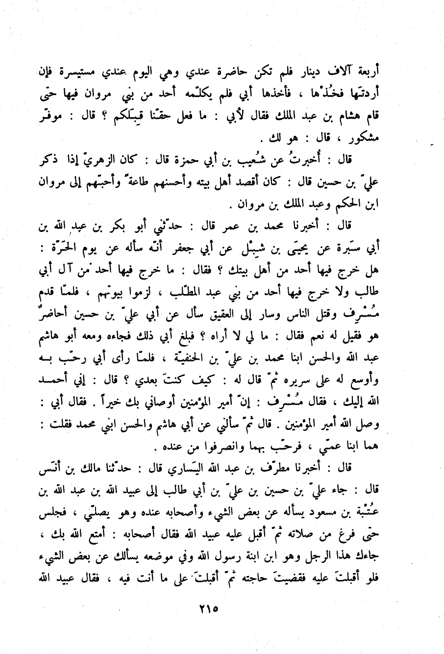 قَالَ أَخْبَرَنَا مُطَرِّفُ بْنُ عَبْدِ اللَّهِ الْيَسَارِيُّ قَالَ: حَدَّثَنَا مَالِكُ بْنُ أَنَسٍ قَالَ: جَاءَ عَلِيُّ بْنُ حُسَيْنِ بْنِ عَلِيِّ بْنِ أَبِي طَالِبٍ إِلَى عُبَيْدِ اللَّهِ بْنِ عَبْدِ اللَّهِ بْنِ عُتْبَةَ بْنِ مَسْعُودٍ §يَسْأَلُهُ عَنْ بَعْضِ الشَّيْءِ وَأَصْحَابُهُ عِنْدَهُ وَهُوَ يُصَلِّي , فَجَلَسَ حَتَّى فَرَغَ مِنْ صَلَاتِهِ , ثُمَّ أَقْبَلَ عَلَيْهِ عُبَيْدُ اللَّهِ , فَقَالَ أَصْحَابُهُ: أَمْتَعَ اللَّهُ بِكَ؛ جَاءَكَ هَذَا الرَّجُلُ وَهُوَ ابْنُ ابْنَةِ رَسُولِ اللَّهِ وَفِي مَوْضِعِهِ يَسْأَلُكَ عَنْ بَعْضِ الشَّيْءِ , فَلَوْ أَقْبَلْتَ عَلَيْهِ , فَقَضَيْتَ حَاجَتَهُ , ثُمَّ أَقْبَلَتْ عَلَى مَا أَنْتَ فِيهِ , فَقَالَ عُبَيْدُ اللَّهِ -[216]- لَهُمْ: أَيْهَاتِ , لَابُدَّ لِمَنْ طَلَبَ هَذَا الشَّأْنَ مِنْ أَنْ يَتَعَنَّى "