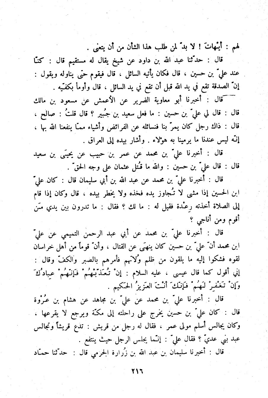 قَالَ أَخْبَرَنَا عَلِيُّ بْنُ مُحَمَّدٍ , عَنْ أَبِي عَبْدِ الرَّحْمَنِ التَّمِيمِيِّ , عَنْ عَلِيِّ بْنِ مُحَمَّدٍ أَنَّ عَلِيَّ بْنَ حُسَيْنٍ كَانَ يَنْهَى عَنِ الْقِتَالِ , وَأَنَّ قَوْمًا مِنْ أَهْلِ خُرَاسَانَ لَقُوهُ , فَشَكَوْا إِلَيْهِ مَا يَلْقَوْنَ مِنْ ظُلْمِ وُلَاتِهِمْ , فَأَمَرَهُمْ بِالصَّبِرِ وَالْكَفِّ , وَقَالَ: إِنِّي أَقُولُ كَمَا قَالَ عِيسَى عَلَيْهِ السَّلَامُ: {§إِنْ تُعَذِّبْهُمْ فَإِنَّهُمْ عِبَادُكَ وَإِنْ تَغْفِرْ لَهُمْ فَإِنَّكَ أَنْتَ الْعَزِيزُ الْحَكِيمُ} [المائدة: 118] "