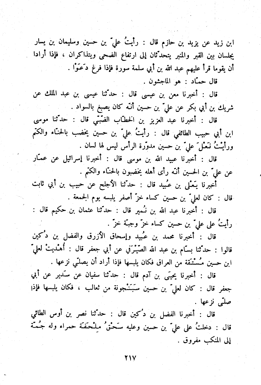 قَالَ أَخْبَرَنَا الْفَضْلُ بْنُ دُكَيْنٍ قَالَ: حَدَّثَنَا نَصْرُ بْنُ أَوْسٍ الطَّائِيُّ قَالَ: دَخَلْتُ عَلَى عَلِيِّ بْنِ حُسَيْنٍ §وَعَلَيْهِ سَحْقُ مِلْحَفَةٍ حَمْرَاءَ وَلَهُ جُمَّةٌ إِلَى الْمَنْكِبِ مَفْرُوقٌ "