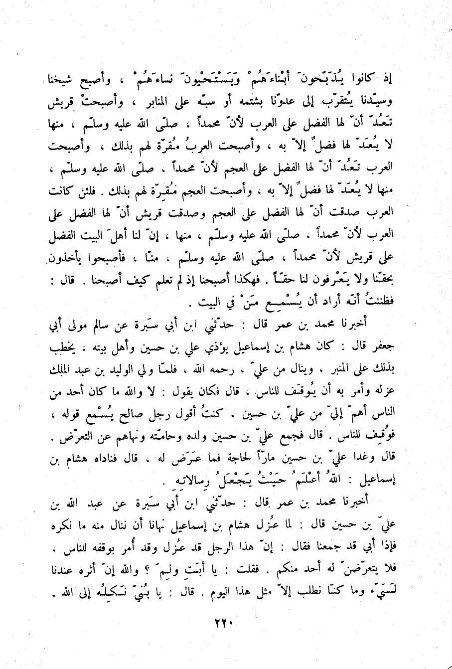 إِذْ كَانُوا يُذَبِّحُونَ أَبْنَاءَهُمْ وَيَسْتَحْيُونَ نِسَاءَهُمْ. وَأَصْبَحَ شَيْخُنَا وَسَيِّدُنَا يَتَقَرَّبُ إِلَى عَدُوِّنَا بِشَتْمِهِ أَوْ سَبِّهِ عَلَى الْمَنَابِرِ. وَأَصْبَحَتْ قُرَيْشٌ تَعُدُّ أَنَّ لَهَا الْفَضْلَ عَلَى الْعَرَبِ؛ لِأَنَّ مُحَمَّدًا صلّى الله عليه وسلم مِنْهَا. لَا يُعَدُّ لَهَا فَضْلٌ إِلَّا بِهِ , وَأَصْبَحَتِ الْعَرَبُ مُقِرَّةً لَهُمْ بِذَلِكَ , وَأَصْبَحَتِ الْعَرَبُ تَعُدُّ أَنَّ لَهَا الْفَضْلُ عَلَى الْعَجَمِ؛ لِأَنَّ مُحَمَّدًا صلّى الله عليه وسلم مِنْهَا لَا يُعَدُّ لَهَا فَضْلٌ إِلَّا بِهِ , وَأَصْبَحَتِ الْعَجَمُ مُقِرَّةً لَهُمْ بِذَلِكَ , فَلَئِنْ كَانَتِ الْعَرَبُ صَدَقَتْ أَنَّ لَهَا الْفَضْلَ عَلَى الْعَجَمِ , وَصَدَقَتْ قُرَيْشٌ أَنَّ لَهَا الْفَضْلَ عَلَى الْعَرَبِ لِأَنَّ مُحَمَّدًا صلّى الله عليه وسلم مِنْهَا إِنَّ لَنَا أَهْلَ الْبَيْتِ الْفَضْلَ عَلَى قُرَيْشٍ؛ لِأَنَّ مُحَمَّدًا صلّى الله عليه وسلم مِنَّا , فَأَصْبَحُوا يَأْخُذُونَ بِحَقِّنَا وَلَا يَعْرِفُونَ لَنَا حَقًّا , فَهَكَذَا أَصْبَحْنَا إِذْ لَمْ تَعْلَمْ كَيْفَ أَصْبَحْنَا قَالَ: فَظَنَنْتُ أَنَّهُ أَرَادَ أَنْ يُسْمِعَ مَنْ فِي الْبَيْتِ "