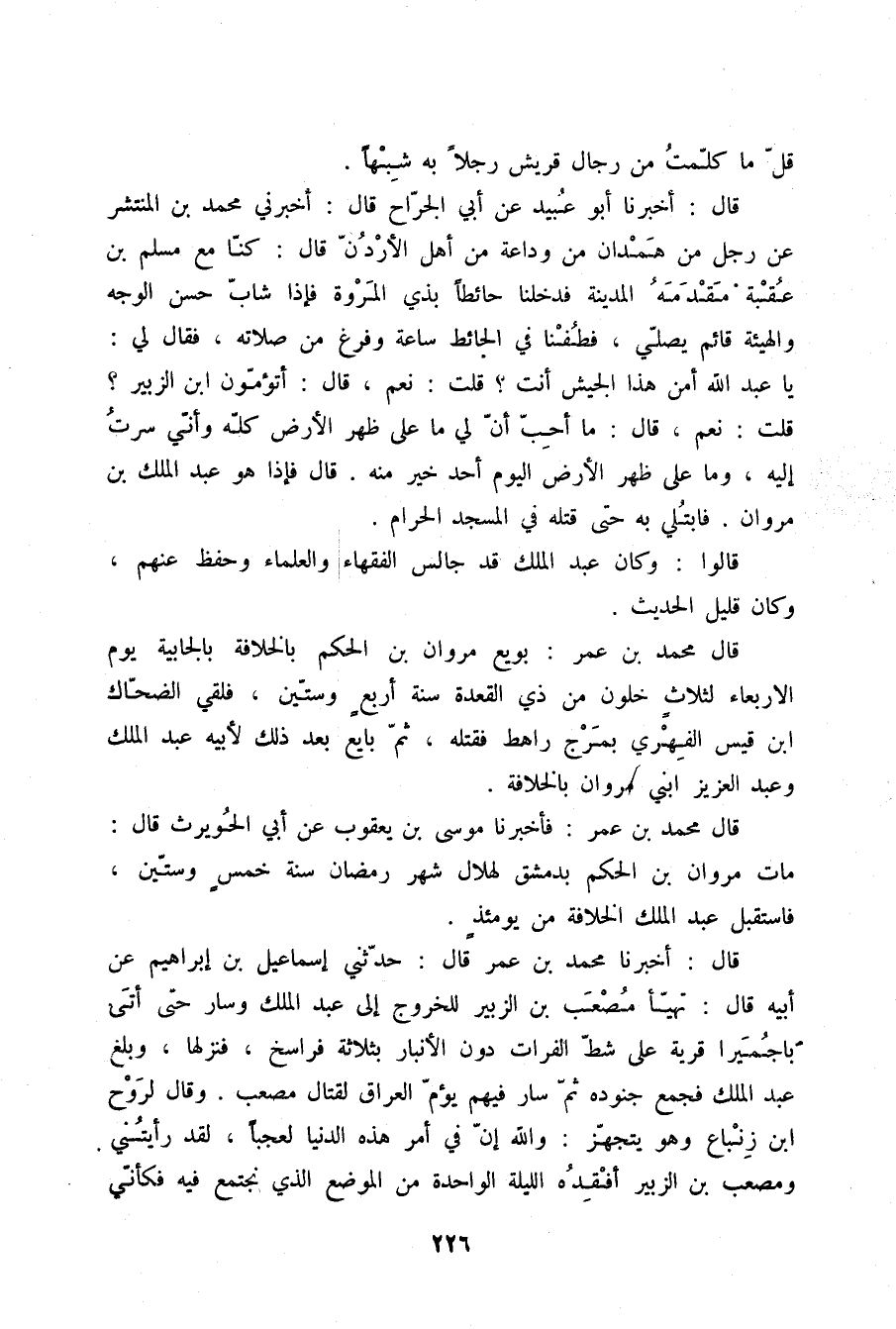 قَالَ أَخْبَرَنَا أَبُو عُبَيْدٍ , عَنْ أَبِي الْجَرَّاحِ قَالَ: أَخْبَرَنِي مُحَمَّدُ بْنُ الْمُنْتَشِرِ , عَنْ رَجُلٍ مِنْ هَمْدَانَ مِنْ وَدَاعَةَ مِنْ أَهْلِ الْأُرْدُنِّ قَالَ: كُنَّا مَعَ مُسْلِمِ بْنِ عُقْبَةَ مَقْدَمَهُ الْمَدِينَةَ فَدَخَلْنَا حَائِطًا بِذِي الْمَرْوَةِ فَإِذَا شَابٌّ حَسَنُ الْوَجْهِ وَالْهَيْئَةِ قَائِمٌ يُصَلِّي , فَطُفْنَا فِي الْحَائِطِ سَاعَةً , وَفَرَغَ مِنْ صَلَاتِهِ فَقَالَ لِي: يَا عَبْدَ اللَّهِ , أَمِنْ هَذَا الْجَيْشِ أَنْتَ؟ قُلْتُ: نَعَمْ. قَالَ: أَتَؤُمُّونَ ابْنَ الزُّبَيْرِ؟ قُلْتُ: نَعَمْ. قَالَ: §مَا أَحَبُّ أَنَّ لِيَ مَا عَلَى ظَهْرِ الْأَرْضِ كُلِّهِ , وَأَنِّي سِرْتُ إِلَيْهِ , وَمَا عَلَى ظَهْرِ الْأَرْضِ الْيَوْمَ أَحَدٌ خَيْرٌ مِنْهُ. قَالَ: فَإِذَا هُوَ عَبْدُ الْمَلِكِ بْنُ مَرْوَانَ فَابْتُلِيَ بِهِ حَتَّى قَتَلَهُ فِي الْمَسْجِدِ الْحَرَامِ. قَالُوا: وَكَانَ عَبْدُ الْمَلِكِ قَدْ جَالَسَ الْفُقَهَاءَ وَالْعُلَمَاءَ , وَحَفِظَ عَنْهُمْ , وَكَانَ قَلِيلَ الْحَدِيثِ " قَالَ مُحَمَّدُ بْنُ عُمَرَ: بُويِعَ مَرْوَانُ بْنُ الْحَكَمِ بِالْخِلَافَةِ بِالْجَابِيَةِ يَوْمَ الْأَرْبِعَاءِ لِثَلَاثٍ خَلَوْنَ مِنْ ذِي الْقَعْدَةِ سَنَةَ أَرْبَعٍ وَسِتِّينَ , فَلَقِيَ الضَّحَّاكَ بْنَ قَيْسٍ الْفِهْرِيَّ بِمَرْجِ رَاهِطٍ فَقَتَلَهُ , ثُمَّ بَايَعَ بَعْدَ ذَلِكَ لِأَبِيهِ عَبْدِ الْمَلِكِ وَعَبْدِ الْعَزِيزِ ابْنِي مَرْوَانَ بِالْخِلَافَةِ قَالَ مُحَمَّدُ بْنُ عُمَرَ: فَأَخْبَرَنَا مُوسَى بْنُ يَعْقُوبَ , عَنْ أَبِي الْحُوَيْرِثِ قَالَ: مَاتَ مَرْوَانُ بْنُ الْحَكَمِ بِدِمَشْقَ لِهِلَالِ شَهْرِ رَمَضَانَ سَنَةِ خَمْسٍ وَسِتِّينَ , فَاسْتَقْبَلَ عَبْدُ الْمَلِكِ الْخِلَافَةَ مِنْ يَوْمَئِذِ