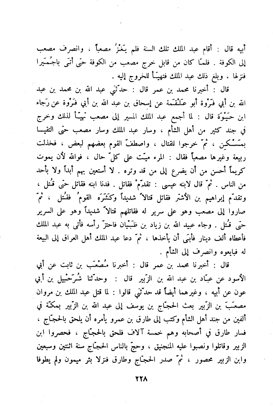 قَالَ أَخْبَرَنَا مُحَمَّدُ بْنُ عُمَرَ قَالَ: حَدَّثَنِي عَبْدُ اللَّهِ بْنُ مُحَمَّدِ بْنِ عَبْدِ اللَّهِ بْنِ أَبِي فَرْوَةَ أَبُو عَلْقَمَةَ , عَنْ إِسْحَاقَ بْنِ عَبْدِ اللَّهِ بْنِ أَبِي فَرْوَةَ , عَنْ رَجَاءِ بْنِ حَيْوَةَ قَالَ: لَمَّا أَجْمَعَ عَبْدُ الْمَلِكِ الْمَسِيرَ إِلَى مُصْعَبٍ تَهَيَّأَ لِذَلِكَ , وَخَرَجَ فِي جُنْدٍ كَثِيرٍ مِنْ أَهْلِ الشَّامِ , وَسَارَ عَبْدُ الْمَلِكِ وَسَارَ مُصْعَبٌ حَتَّى الْتَقَيَا بِمَسْكِنَ , ثُمَّ خَرَجُوا لِلْقِتَالِ , وَاصْطَفَّ الْقَوْمُ بَعْضُهُمْ لِبَعْضٍ , فَخَذَلَتْ رَبِيعَةُ وَغَيْرُهَا مُصْعَبًا , فَقَالَ: الْمَرْءُ مَيِّتٌ عَلَى كُلِّ حَالٍ , §فَوَاللَّهِ لَأَنْ يَمُوتَ كَرِيمًا أَحْسَنُ مِنْ أَنْ يَضْرَعَ إِلَى مَنْ قَدْ وَتَرَهُ. لَا أَسْتَعِينُ بِهِمْ أَبَدًا , وَلَا بِأَحَدٍ مِنَ النَّاسِ , ثُمَّ قَالَ لِابْنِهِ عِيسَى: تَقَدَّمْ؛ فَقَاتِلْ. فَدَنَا ابْنُهُ , فَقَاتَلَ حَتَّى قُتِلَ , وَتَقَدَّمَ إِبْرَاهِيمُ بْنُ الْأَشْتَرِ فَقَاتَلَ قِتَالًا شَدِيدًا وَكَثَرَهُ الْقَوْمُ , فَقُتِلَ , ثُمَّ صَارُوا إِلَى مُصْعَبٍ وَهُوَ عَلَى سَرِيرٍ لَهُ , فَقَاتَلَهُمْ قِتَالًا شَدِيدًا وَهُوَ عَلَى السَّرِيرِ حَتَّى قُتِلَ , وَجَاءَ عُبَيْدُ اللَّهِ بْنُ زِيَادِ بْنِ ظَبْيَانَ فَاحْتَزَّ رَأْسَهُ فَأَتَى بِهِ عَبْدُ الْمَلِكِ فَأَعْطَاهُ أَلْفَ دِينَارٍ , فَأَبَى أَنْ يَأْخُذَهَا ثُمَّ دَعَا عَبْدُ الْمَلِكِ أَهْلَ الْعِرَاقِ إِلَى الْبَيْعَةِ لَهُ فَبَايَعُوهُ , وَانْصَرَفَ إِلَى الشَّامِ "