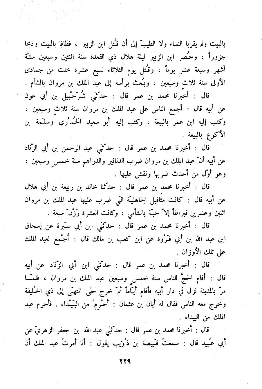قَالَ أَخْبَرَنَا مُحَمَّدُ بْنُ عُمَرَ قَالَ: حَدَّثَنِي عَبْدُ الرَّحْمَنِ بْنُ أَبِي الزِّنَادِ , عَنْ أَبِيهِ أَنَّ عَبْدَ الْمَلِكِ بْنَ مَرْوَانَ §ضَرَبَ الدَّنَانِيرَ وَالدَّرَاهِمَ سَنَةَ خَمْسٍ وَسَبْعِينَ , وَهُوَ أَوَّلُ مَنْ أَحْدَثَ ضَرْبَهَا وَنَقَشَ عَلَيْهَا "
