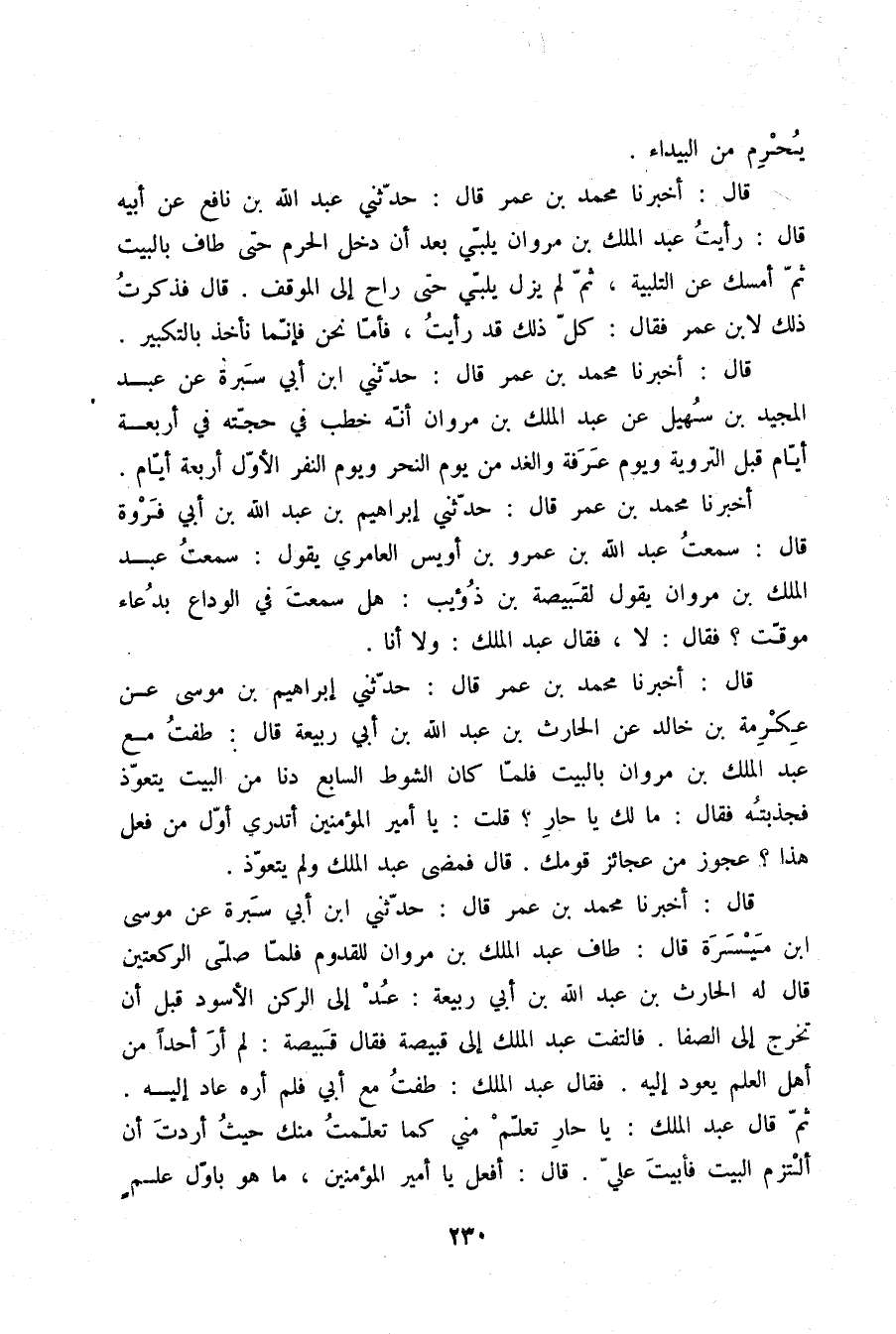 قَالَ أَخْبَرَنَا مُحَمَّدُ بْنُ عُمَرَ قَالَ: حَدَّثَنِي ابْنُ أَبِي سَبْرَةَ , عَنْ مُوسَى بْنِ مَيْسَرَةَ قَالَ: طَافَ عَبْدُ الْمَلِكِ بْنُ مَرْوَانَ لِلْقُدُومِ , فَلَمَّا صَلَّى الرَّكْعَتَيْنِ قَالَ لَهُ الْحَارِثُ بْنُ عَبْدِ اللَّهِ بْنِ أَبِي رَبِيعَةَ: عُدْ إِلَى الرُّكْنِ الْأَسْوَدِ قَبْلَ أَنْ تَخْرُجَ إِلَى الصَّفَا , فَالْتَفَتَ عَبْدُ الْمَلِكِ إِلَى قَبِيصَةَ , فَقَالَ قَبِيصَةُ: لَمْ أَرَ أَحَدًا مِنْ أَهْلِ الْعِلْمِ يَعُودُ إِلَيْهِ , فَقَالَ عَبْدُ الْمَلِكِ: طُفْتُ مَعَ أَبِي فَلَمْ أَرَهُ عَادَ إِلَيْهِ , ثُمَّ قَالَ عَبْدُ الْمَلِكِ: يَا حَارِ , §تَعَلَّمْ مِنِّي كَمَا تَعَلَّمْتُ مِنْكَ حَيْثُ أَرَدْتُ أَنْ أَلْتَزِمَ الْبَيْتَ فَأَبَيْتَ عَلَيَّ. قَالَ: أَفْعَلُ يَا أَمِيرَ الْمُؤْمِنِينَ. مَا هُوَ بِأَوَّلِ عِلْمٍ -[231]- اسْتَفَدْتُ مِنْ عِلْمِكَ "