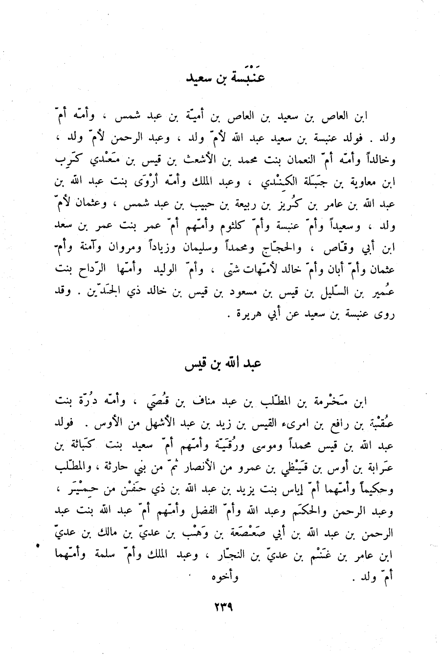 §عَنْبَسَةُ بْنُ سَعِيدِ بْنِ الْعَاصِ بْنِ سَعِيدِ بْنِ الْعَاصِ بْنِ أُمَيَّةَ بْنِ عَبْدِ شَمْسٍ وَأُمُّهُ أُمُّ وَلَدٍ , فَوَلَدَ عَنْبَسَةُ بْنُ سَعِيدِ عَبْدَ اللَّهِ لِأُمِّ وَلَدٍ , وَعَبْدَ الرَّحْمَنِ لِأُمِّ وَلَدٍ , وَخَالِدًا وَأُمُّهُ أُمُّ النُّعْمَانِ بِنْتُ مُحَمَّدِ بْنِ الْأَشْعَثِ بْنِ قَيْسِ بْنِ مَعْدِي كَرِبَ بْنِ مُعَاوِيَةَ بْنِ جَبَلَةَ الْكِنْدِيِّ , وَعَبْدَ الْمَلِكِ وَأُمُّهُ أَرْوَى بِنْتُ عَبْدِ اللَّهِ بْنِ عَبْدِ اللَّهِ بْنِ عَامِرِ بْنِ كُرَيْزِ بْنِ رَبِيعَةَ بْنِ حَبِيبِ بْنِ عَبْدِ شَمْسٍ , وَعُثْمَانَ لِأُمِّ وَلَدٍ , وَسَعِيدًا , وَأُمَّ عَنْبَسَةَ , وَأُمَّ كُلْثُومٍ وَأُمُّهُمْ أُمُّ عُمَرَ بِنْتُ عُمَرَ بْنِ سَعْدِ بْنِ أَبِي وَقَّاصٍ , وَالْحَجَّاجَ , وَمُحَمَّدًا , وَسُلَيْمَانَ , وزِيَادًا , وَمَرْوَانَ , وَآمِنَةَ , وَأُمَّ عُثْمَانَ , وَأُمَّ أَبَانَ , وَأُمَّ خَالِدٍ لِأُمَّهَاتٍ شَتَّى , وَأُمَّ الْوَلِيدِ وَأُمُّهَا الرَّدَاحُ بِنْتُ عُمَيْرِ بْنِ السَّلِيلِ بْنِ قَيْسِ بْنِ مَسْعُودِ بْنِ قَيْسِ بْنِ خَالِدٍ ذِي الْجَدَّيْنِ. وَقَدْ رَوَى عَنْبَسَةُ بْنُ سَعِيدٍ عَنْ أَبِي هُرَيْرَةَ