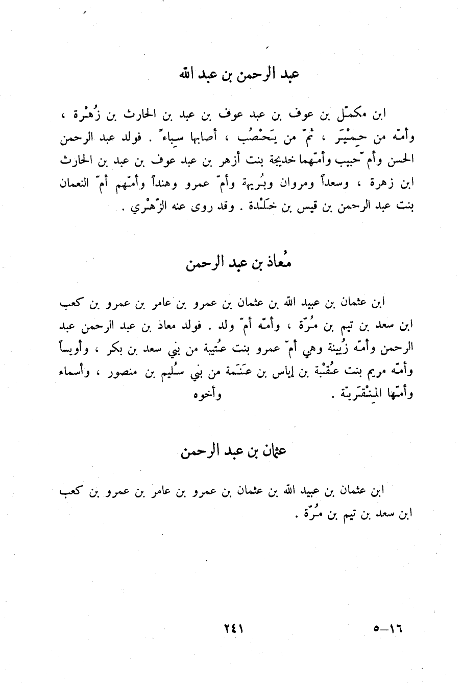 §مُعَاذُ بْنُ عَبْدِ الرَّحْمَنِ بْنِ عُثْمَانَ بْنِ عُبَيْدِ اللَّهِ بْنِ عُثْمَانَ بْنِ عَمْرِو بْنِ عَامِرِ بْنِ عَمْرِو بْنِ كَعْبِ بْنِ سَعْدِ بْنِ تَيْمِ بْنِ مُرَّةَ وَأُمُّهُ أُمُّ وَلَدٍ , فَوَلَدَ مُعَاذُ بْنُ عَبْدِ الرَّحْمَنِ عَبْدَ الرَّحْمَنِ وَأُمُّهُ زُيَيْنَةُ وَهِيَ أُمُّ عَمْرٍو بِنْتُ عُتَيْبَةَ مِنْ بَنِي سَعْدِ بْنِ بَكْرٍ , وَأُوَيْسًا وَأُمُّهُ مَرْيَمُ بِنْتُ عُقْبَةَ بْنِ إِيَاسِ بْنِ عَنَمَةَ مِنْ بَنِي سُلَيْمِ بْنِ مَنْصُورٍ , وَأَسْمَاءَ وَأُمُّهَا الْمِنْقَرِيَّةُ