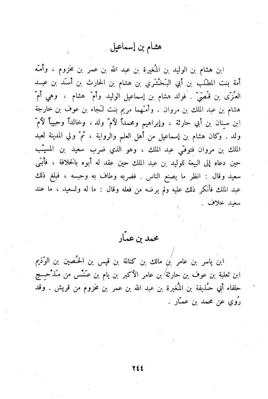 §هِشَامُ بْنُ إِسْمَاعِيلَ بْنِ هِشَامِ بْنِ الْوَلِيدِ بْنِ الْمُغِيرَةِ بْنِ عَبْدِ اللَّهِ بْنِ عُمَرَ بْنِ مَخْزُومٍ وَأُمُّهُ أَمَةُ بِنْتُ الْمُطَّلِبِ بْنِ أَبِي الْبَخْتَرِيِّ بْنِ هِشَامِ بْنِ الْحَارِثِ بْنِ أَسَدِ بْنِ عَبْدِ الْعُزَّى بْنِ قُصَيٍّ , فَوَلَدَ هِشَامُ بْنُ إِسْمَاعِيلَ الْوَلِيدَ , وَأُمَّ هِشَامٍ وَهِيَ أُمُّ هِشَامِ بْنِ عَبْدِ الْمَلِكِ بْنِ مَرْوَانَ وَأُمُّهُمَا مَرْيَمُ بِنْتُ لَجَاءِ بْنِ عَوْفِ بْنِ خَارِجَةَ بْنِ سِنَانِ بْنِ أَبِي حَارِثَةَ , وَإِبْرَاهِيمَ , وَمُحَمَّدًا لِأُمِّ وَلَدٍ , وَخَالِدًا , وَحَبِيبًا لِأُمِّ وَلَدٍ , وَكَانَ هِشَامُ بْنُ إِسْمَاعِيلَ مِنْ أَهْلِ الْعِلْمِ وَالرِّوَايَةِ , ثُمَّ وَلِيَ الْمَدِينَةَ لِعَبْدِ الْمَلِكِ بْنِ مَرْوَانَ , فَتُوُفِّيَ عَبْدُ الْمَلِكِ وَهُوَ الَّذِي ضَرَبَ سَعِيدَ بْنَ الْمُسَيِّبِ حِينَ دَعَاهُ إِلَى الْبَيْعَةِ لِلْوَلِيدِ بْنِ عَبْدِ الْمَلِكِ حِينَ عَقَدَ لَهُ أَبُوهُ بِالْخِلَافَةِ فَأَبَى سَعِيدٌ , وَقَالَ: أَنْظُرُ مَا يَصْنَعُ النَّاسُ , فَضَرَبَهُ وَطَافَ بِهِ وَحَبْسَهُ , فَبَلَغَ ذَلِكَ عَبْدَ الْمَلِكِ , فَأَنْكَرَ ذَلِكَ عَلَيْهِ , وَلَمْ يَرْضَهُ مِنْ فِعْلِهِ , وَقَالَ: مَا لَهُ وَلِسَعِيدٍ , مَا عِنْدَ سَعِيدٍ خِلَافٌ
