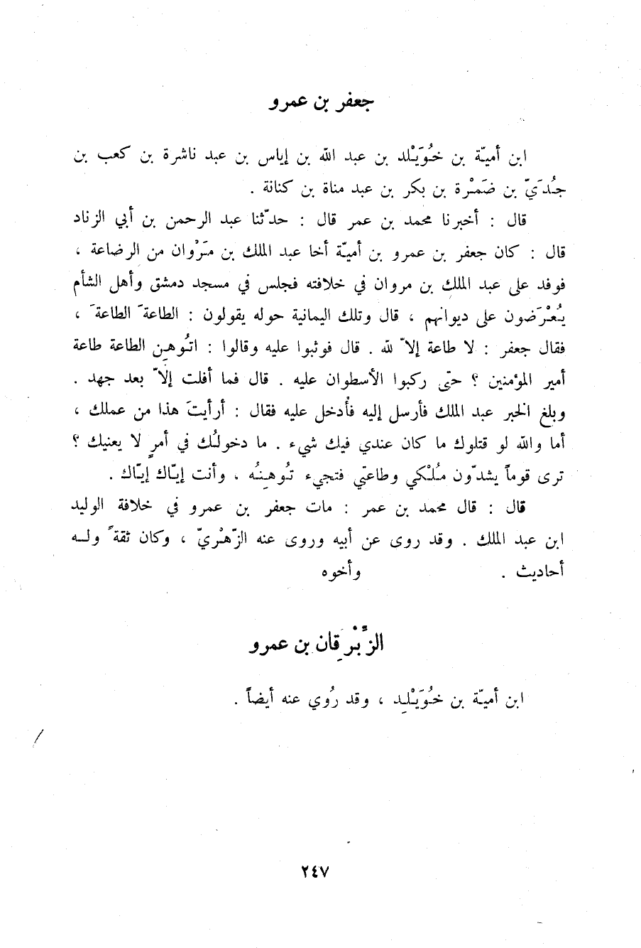 قَالَ أَخْبَرَنَا مُحَمَّدُ بْنُ عُمَرَ قَالَ: حَدَّثَنَا عَبْدُ الرَّحْمَنِ بْنُ أَبِي الزِّنَادِ قَالَ: كَانَ جَعْفَرُ بْنُ عَمْرِو بْنِ أُمَيَّةَ أَخَا عَبْدِ الْمَلِكِ بْنِ مَرْوَانَ مِنَ الرَّضَاعَةِ , فَوَفَدَ عَلَى عَبْدِ الْمَلِكِ بْنِ مَرْوَانَ فِي خِلَافَتِهِ , فَجَلَسَ فِي مَسْجِدِ دِمَشْقَ وَأَهْلُ الشَّامِ يُعْرَضُونَ عَلَى دِيوَانِهِمْ. قَالَ: وَتِلْكَ الْيَمَانِيَةُ حَوْلَهُ يَقُولُونَ: الطَّاعَةَ الطَّاعَةَ , فَقَالَ جَعْفَرٌ: §لَا طَاعَةَ إِلَّا لِلَّهِ. قَالَ: فَوَثَبُوا عَلَيْهِ , وَقَالُوا: أَتُوهِنُ الطَّاعَةَ طَاعَةَ أَمِيرِ الْمُؤْمِنِينَ؟ حَتَّى رَكِبُوا الْأُسْطُوَانَ عَلَيْهِ. قَالَ: فَمَا أَفْلَتَ إِلَّا بَعْدَ جَهْدٍ , وَبَلَغَ الْخَبَرُ عَبْدَ الْمَلِكِ , فَأَرْسَلَ إِلَيْهِ , فَأُدْخِلَ عَلَيْهِ , فَقَالَ: أَرَأَيْتَ هَذَا مِنْ عَمَلِكَ أَمَا وَاللَّهِ لَوْ قَتَلُوكَ مَا كَانَ عِنْدِي فِيكَ شَيْءٌ مَا دُخُولُكَ فِي أَمْرٍ لَا يَعْنِيكَ؟ تَرَى قَوْمًا يَشُدُّونَ مُلْكِي وَطَاعَتِي فَتَجِيءُ تُوهِنُهُ وَأَنْتَ إِيَّاكَ إِيَّاكَ " قَالَ: قَالَ مُحَمَّدُ بْنُ عُمَرَ مَاتَ جَعْفَرُ بْنُ عَمْرٍو فِي خِلَافَةِ الْوَلِيدِ بْنِ عَبْدِ الْمَلِكِ , وَقَدْ رَوَى عَنْ أَبِيهِ , وَرَوَى عَنْهُ الزُّهْرِيُّ , وَكَانَ ثِقَةً , وَلَهُ أَحَادِيثُ