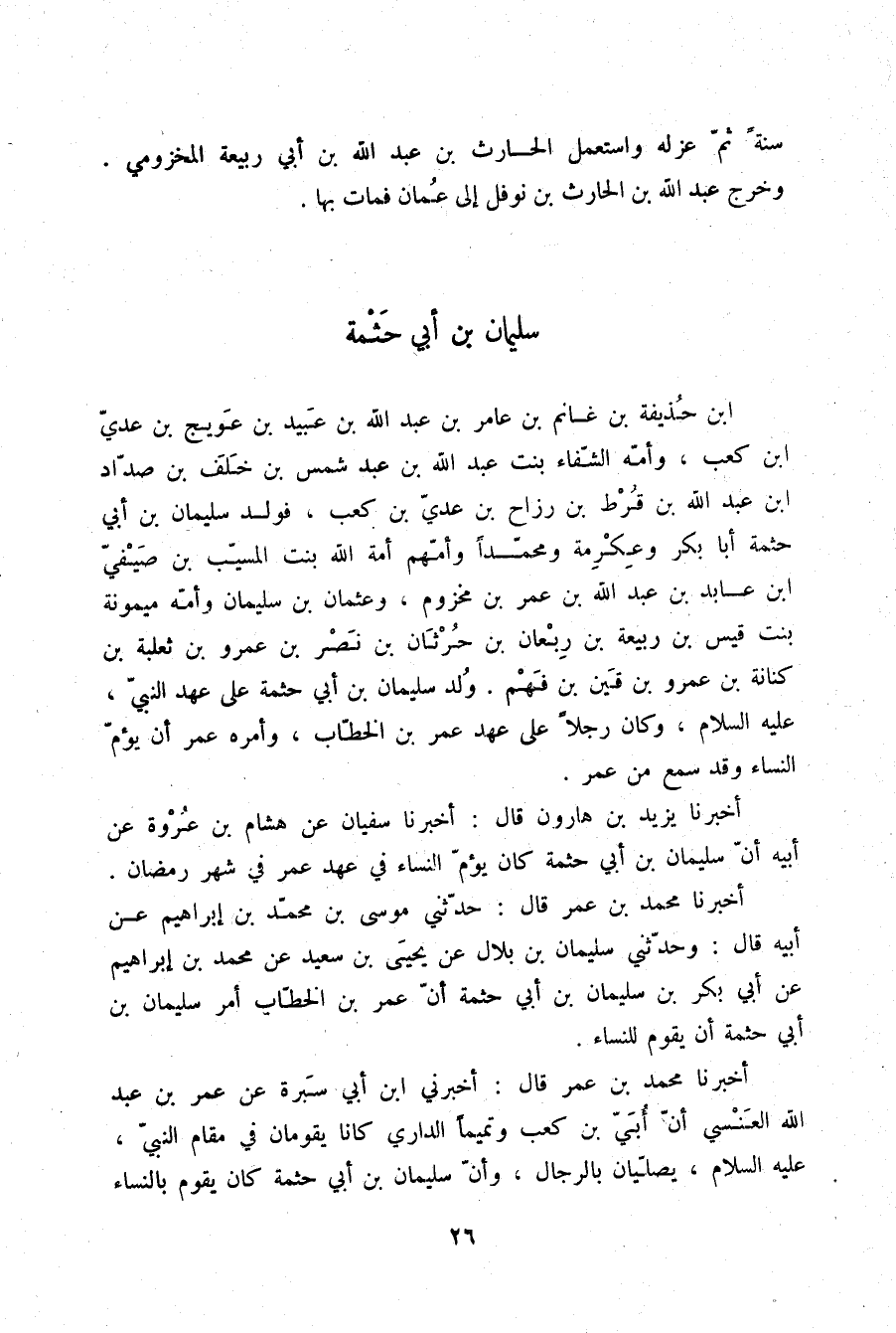 أَخْبَرَنَا يَزِيدُ بْنُ هَارُونَ , قَالَ: أَخْبَرَنَا سُفْيَانُ , عَنْ هِشَامِ بْنِ عُرْوَةَ , عَنْ أَبِيهِ , أَنَّ سُلَيْمَانَ بْنَ أَبِي حَثْمَةَ , §كَانَ يَؤُمُّ النِّسَاءَ فِي عَهْدِ عُمَرَ فِي شَهْرِ رَمَضَانَ "