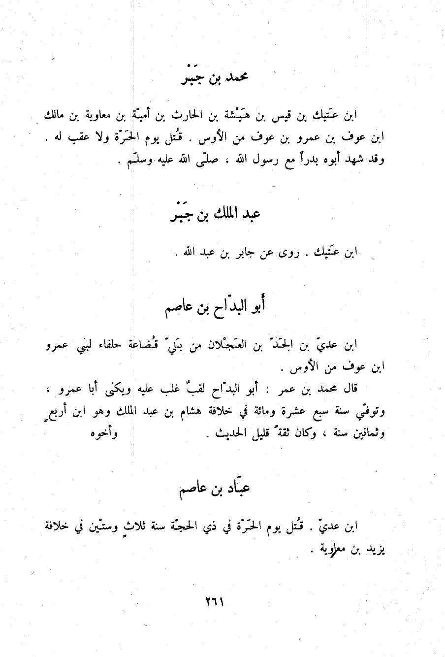 §مُحَمَّدُ بْنُ جَبْرِ بْنِ عَتِيكِ بْنِ قَيْسِ بْنِ هَيْشَةَ بْنِ الْحَارِثِ بْنِ أُمَيَّةَ بْنِ مُعَاوِيَةَ بْنِ مَالِكِ بْنِ عَوْفِ بْنِ عَمْرِو بْنِ عَوْفٍ مِنَ الْأَوْسِ قُتِلَ يَوْمَ الْحَرَّةِ , وَلَا عَقِبَ لَهُ , وَقَدْ شَهِدَ أَبُوهُ بَدْرًا مَعَ رَسُولِ اللَّهِ صلّى الله عليه وسلم