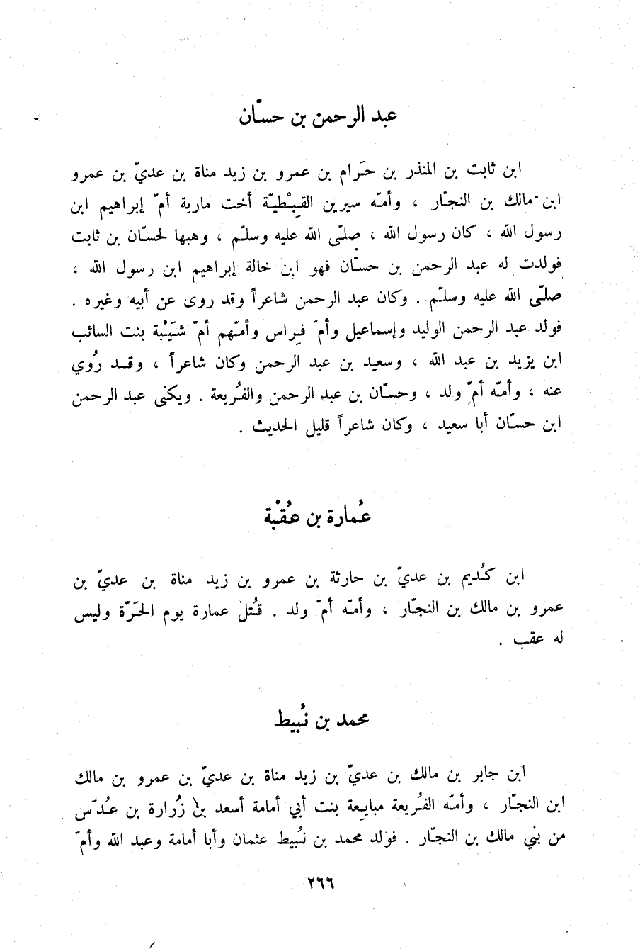 §مُحَمَّدُ بْنُ نُبَيْطِ بْنِ جَابِرِ بْنِ مَالِكِ بْنِ عَدِيِّ بْنِ زَيْدِ مَنَاةَ بْنِ عَدِيِّ بْنِ عَمْرِو بْنِ مَالِكِ بْنِ النَّجَّارِ وَأُمُّهُ الْفُرَيْعَةُ مُبَايِعَةُ بِنْتُ أَبِي أُمَامَةَ أَسْعَدَ بْنِ زُرَارَةَ بْنِ عُدُسٍ مِنْ بَنِي مَالِكِ بْنِ النَّجَّارِ , فَوَلَدَ مُحَمَّدُ بْنُ نُبَيْطٍ عُثْمَانَ , وَأَبَا أُمَامَةَ , وَعَبْدَ اللَّهِ , وَأُمَّ -[267]- كُلْثُومٍ وَأُمُّهُمْ أُمُّ عَبْدِ اللَّهِ بِنْتُ عُمَارَةَ بْنِ الْحُبَابِ بْنِ سَعْدِ بْنِ قَيْسِ بْنِ عَمْرِو بْنِ زَيْدِ مَنَاةَ مِنْ بَنِي مَالِكِ بْنِ النَّجَّارِ. قُتِلَ مُحَمَّدُ بْنُ نُبَيْطٍ يَوْمَ الْحَرَّةِ وَلَيْسَ لَهُ عَقِبٌ
